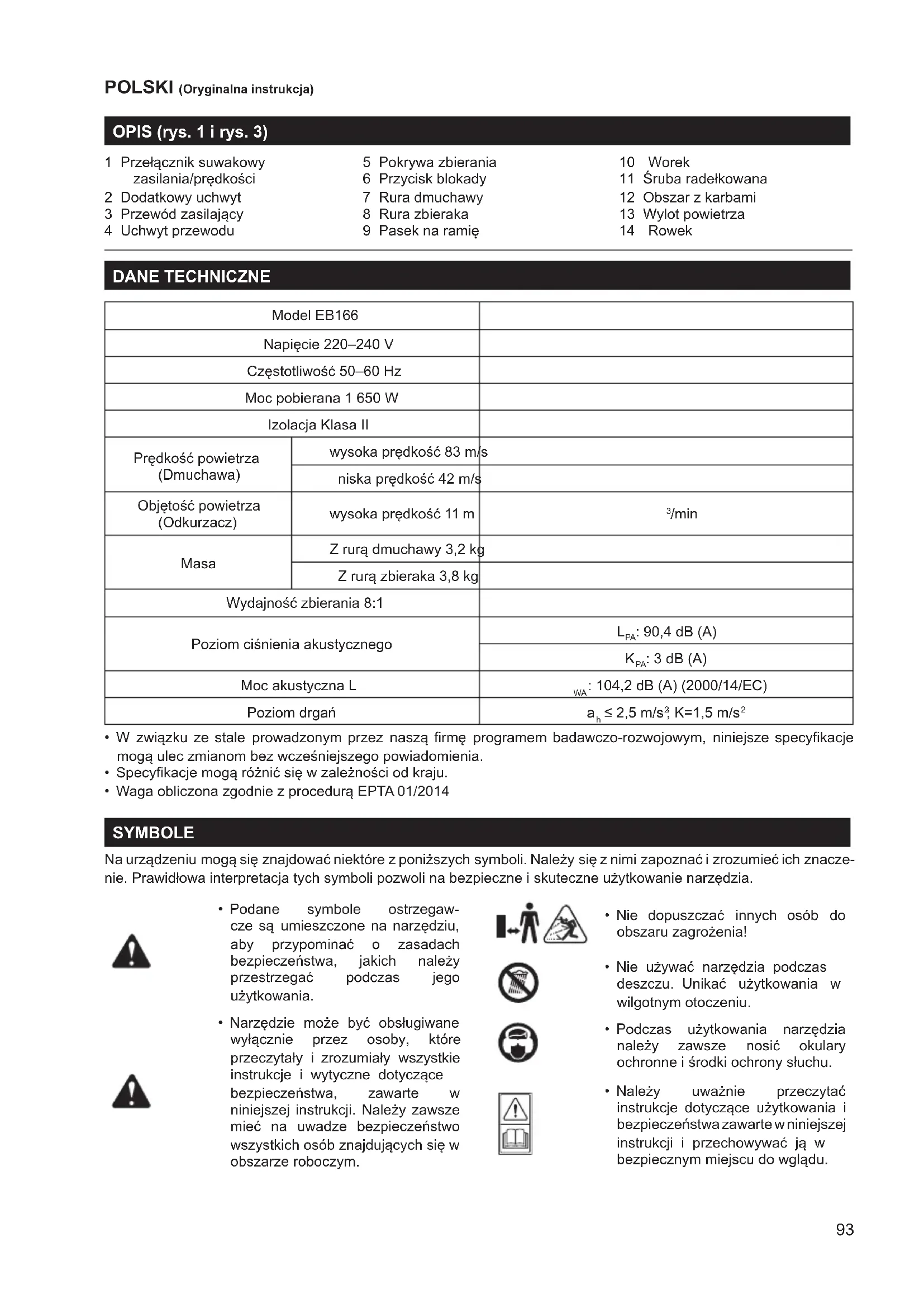 - Hoiustage tööriista kuivas ja lastele kättesaamatus kohas. TOITEJUHTME HOOLDAMINE Kui toitejuhe vajab vahetamist, tuleb ohutuse tagamiseks lasta see vahetada volitatud hoolduskeskuses. Kui toitejuhe on kahjustunud, tuleb see ohu vältimiseks lasta asendada Dolmar hoolduskeskuses.93 POLSKI (Oryginalna instrukcja) OPIS (rys. 1 i rys. 3) 1 Przełącznik suwakowy zasilania/prędkości 2 Dodatkowy uchwyt 3 Przewód zasilający 4 Uchwyt przewodu 5 Pokrywa zbierania 6 Przycisk blokady 7 Rura dmuchawy 8 Rura zbieraka 9 Pasek na ramię 10 Worek 11 Śruba radełkowana 12 Obszar z karbami 13 Wylot powietrza 14 Rowek DANE TECHNICZNE Model EB166 Napięcie 220–240 V Częstotliwość 50–60 Hz Moc pobierana 1 650 W Izolacja Klasa II Prędkość powietrza (Dmuchawa) wysoka prędkość 83 m/s niska prędkość 42 m/s Objętość powietrza (Odkurzacz) wysoka prędkość 11 m