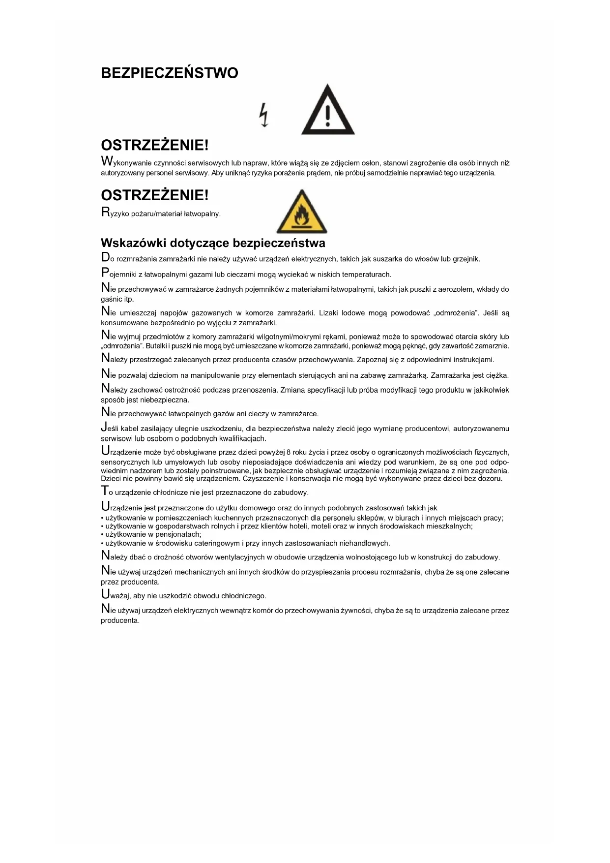 Wskazówki dotyczące bezpieczeństwa Do rozmrażania zamrażarki nie należy używać urządzeń elektrycznych, takich jak suszarka do włosów lub grzejnik. Pojemniki z łatwopalnymi gazami lub cieczami mogą wyciekać w niskich temperaturach. Nie przechowywać w zamrażarce żadnych pojemników z materiałami łatwopalnymi, takich jak puszki z aerozolem, wkłady do gaśnic itp. Nie umieszczaj napojów gazowanych w komorze zamrażarki. Lizaki lodowe mogą powodować „odmrożenia”. Jeśli są konsumowane bezpośrednio po wyjęciu z zamrażarki. Nie wyjmuj przedmiotów z komory zamrażarki wilgotnymi/mokrymi rękami, ponieważ może to spowodować otarcia skóry lub „odmrożenia”. Butelki i puszki nie mogą być umieszczane w komorze zamrażarki, ponieważ mogą pęknąć, gdy zawartość zamarznie. Należy przestrzegać zalecanych przez producenta czasów przechowywania. Zapoznaj się z odpowiednimi instrukcjami. Nie pozwalaj dzieciom na manipulowanie przy elementach sterujących ani na zabawę zamrażarką. Zamrażarka jest ciężka. Należy zachować ostrożność podczas przenoszenia. Zmiana specyfikacji lub próba modyfikacji tego produktu w jakikolwiek sposób jest niebezpieczna. Nie przechowywać łatwopalnych gazów ani cieczy w zamrażarce. Jeśli kabel zasilający ulegnie uszkodzeniu, dla bezpieczeństwa należy zlecić jego wymianę producentowi, autoryzowanemu serwisowi lub osobom o podobnych kwalifikacjach. Urządzenie może być obsługiwane przez dzieci powyżej 8 roku życia i przez osoby o ograniczonych możliwościach fizycznych, sensorycznych lub umysłowych lub osoby nieposiadające doświadczenia ani wiedzy pod warunkiem, że są one pod odpo- wiednim nadzorem lub zostały poinstruowane, jak bezpiecznie obsługiwać urządzenie i rozumieją związane z nim zagrożenia. Dzieci nie powinny bawić się urządzeniem. Czyszczenie i konserwacja nie mogą być wykonywane przez dzieci bez dozoru. To urządzenie chłodnicze nie jest przeznaczone do zabudowy. Urządzenie jest przeznaczone do użytku domowego oraz do innych podobnych zastosowań takich jak