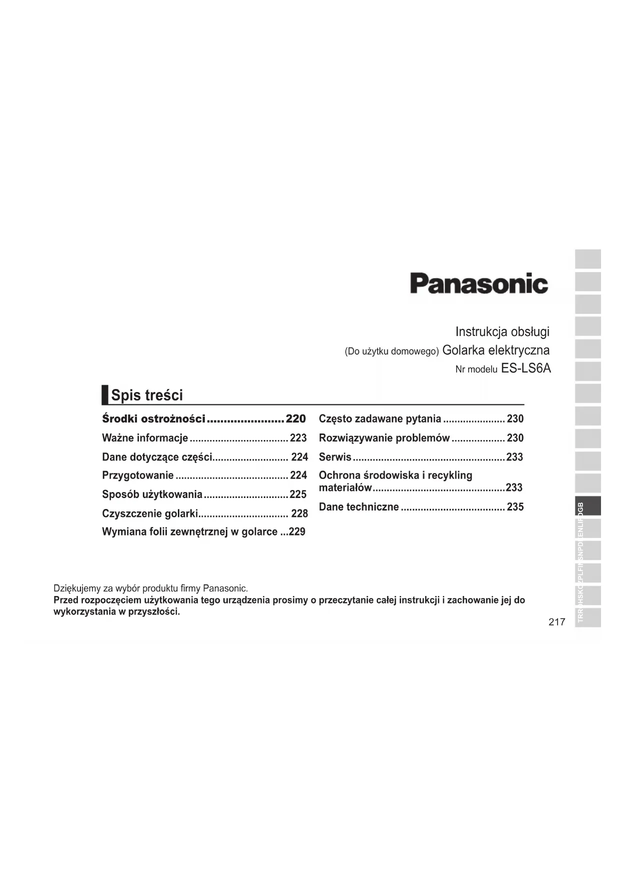 Tekniset tiedot Virtalähde Katso verkkolaitteen arvokilvestä. (automaattinen jännitteenvalinta) Moottorin jännite 3,6 V Latausaika Noin 1 tunti Ilmassa kantautuva melu parranajo: 64 (dB (A) re 1 pW) trimmerin käyttö: 65 (dB (A) re 1 pW) Tämä tuote on tarkoitettu vain kotitalouskäyttöön.216 Lisätietoa tuotteen energiatehokkuudesta saat nettisivuiltamme, osoitteessa, www.panasonic.com, syöttämällä hakukuvaan mallinumeron.217 TR RO H SK CZ PL FIN S N P DK E NL I F D GB Dziękujemy za wybór produktu rmy Panasonic. Przed rozpoczęciem użytkowania tego urządzenia prosimy o przeczytanie całej instrukcji i zachowanie jej do wykorzystania w przyszłości. Instrukcja obsługi (Do użytku domowego) Golarka elektryczna Nr modelu ES‑LS6A Środki ostrożności ....................... 220 Ważne informacje 223 Dane dotyczące części 224 Przygotowanie 224 Sposób użytkowania 225 Czyszczenie golarki 228 Wymiana folii zewnętrznej w golarce 229 Często zadawane pytania 230 Rozwiązywanie problemów 230 Serwis 233 Ochrona środowiska i recykling materiałów 233 Dane techniczne 235 Spis treści218 OSTRZEŻENIE