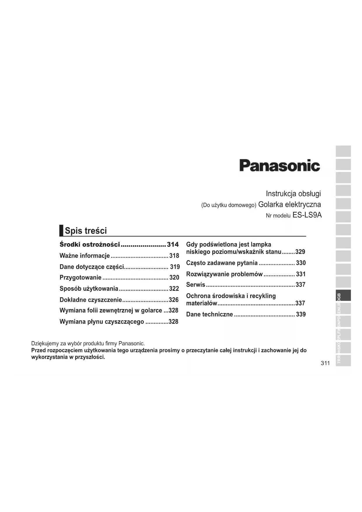 Tekniset tiedot Virtalähde Katso verkkolaitteen arvokilvestä. (automaattinen jännitteenvalinta) Moottorin jännite 3,6 V Latausaika Noin 1 tunti Ilmassa kantautuva melu parranajo: 64 (dB (A) re 1 pW) trimmerin käyttö: 65 (dB (A) re 1 pW) Tämä tuote on tarkoitettu vain kotitalouskäyttöön. Lisätietoa tuotteen energiatehokkuudesta saat nettisivuiltamme, osoitteessa, www.panasonic.com, syöttämällä hakukuvaan mallinumeron.311 TR RO H SK CZ PL FIN S N P DK E NL I F D GB Dziękujemy za wybór produktu rmy Panasonic. Przed rozpoczęciem użytkowania tego urządzenia prosimy o przeczytanie całej instrukcji i zachowanie jej do wykorzystania w przyszłości. Instrukcja obsługi (Do użytku domowego) Golarka elektryczna Nr modelu ES‑LS9A Środki ostrożności ....................... 314 Ważne informacje 318 Dane dotyczące części 319 Przygotowanie 320 Sposób użytkowania 322 Dokładne czyszczenie 326 Wymiana folii zewnętrznej w golarce 328 Wymiana płynu czyszczącego 328 Gdy podświetlona jest lampka niskiego poziomu/wskaźnik stanu 329 Często zadawane pytania 330 Rozwiązywanie problemów 331 Serwis 337 Ochrona środowiska i recykling materiałów 337 Dane techniczne 339 Spis treści312 OSTRZEŻENIE