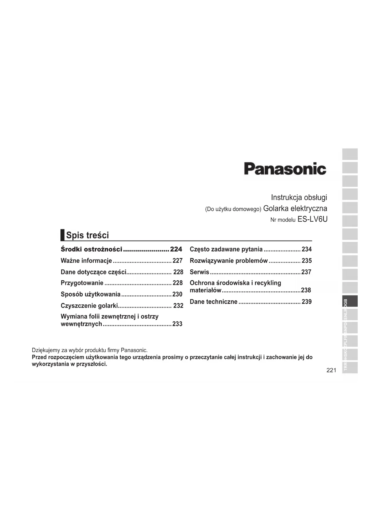 Tekniset tiedot Virtalähde Katso verkkolaitteen arvokilvestä. (automaattinen jännitteenvalinta) Moottorin jännite 3,6 V Latausaika Noin 1 tunti Ilmassa kantautuva melu parranajo: 63 (dB (A) re 1 pW) trimmerin käyttö: 64 (dB (A) re 1 pW) Tämä tuote on tarkoitettu vain kotitalouskäyttöön.220 Lisätietoa tuotteen energiatehokkuudesta saat nettisivuiltamme, osoitteessa, www.panasonic.com, syöttämällä hakukuvaan mallinumeron.221 TR RO H SK CZ PL FIN S N P DK E NL I F D GB Dziękujemy za wybór produktu rmy Panasonic. Przed rozpoczęciem użytkowania tego urządzenia prosimy o przeczytanie całej instrukcji i zachowanie jej do wykorzystania w przyszłości. Instrukcja obsługi (Do użytku domowego) Golarka elektryczna Nr modelu ES‑LV6U Środki ostrożności ....................... 224 Ważne informacje 227 Dane dotyczące części 228 Przygotowanie 228 Sposób użytkowania 230 Czyszczenie golarki 232 Wymiana folii zewnętrznej i ostrzy wewnętrznych 233 Często zadawane pytania 234 Rozwiązywanie problemów 235 Serwis 237 Ochrona środowiska i recykling materiałów 238 Dane techniczne 239 Spis treści222 OSTRZEŻENIE