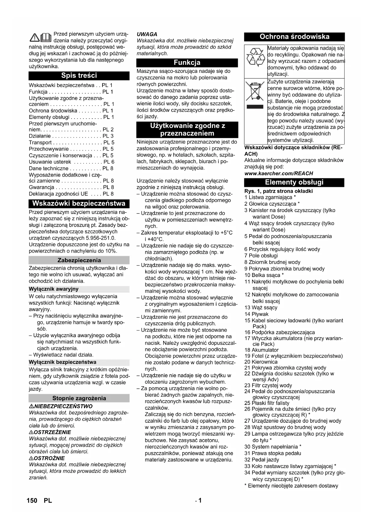 Chairman of the Board of Management Director Regulatory Affairs & Certification 149SL- 1 Przed pierwszym użyciem urzą- dzenia należy przeczytać orygi- nalną instrukcję obsługi, postępować we- dług jej wskazań i zachować ją do później- szego wykorzystania lub dla następnego użytkownika. Przed pierwszym użyciem urządzenia na- leży zapoznać się z niniejszą instrukcją ob- sługi i załączoną broszurą pt. Zasady bez- pieczeństwa dotyczące szczotkowych urządzeń czyszczących 5.956-251.0. Urządzenie dopuszczone jest do użytku na powierzchniach o nachyleniu do 10%. Zabezpieczenia chronią użytkownika i dla- tego nie wolno ich usuwać, wyłączać ani obchodzić ich działania. W celu natychmiastowego wyłączenia wszystkich funkcji: Nacisnąć wyłącznik awaryjny. – Przy naciśnięciu wyłącznika awaryjne- go, urządzenie hamuje w twardy spo- sób. – Użycie wyłącznika awaryjnego odbija się natychmiast na wszystkich funk- cjach urządzenia. – Wyświetlacz nadal działa. Wyłącza silnik trakcyjny z krótkim opóźnie- niem, gdy użytkownik zsiądzie z fotela pod- czas używania urządzenia wzgl. w czasie jazdy. NIEBEZPIECZEŃSTWO Wskazówka dot. bezpośredniego zagroże- nia, prowadzącego do ciężkich obrażeń ciała lub do śmierci. 몇 OSTRZEŻENIE Wskazówka dot. możliwie niebezpiecznej sytuacji, mogącej prowadzić do ciężkich obrażeń ciała lub śmierci. 몇 OSTROŻNIE Wskazówka dot. możliwie niebezpiecznej sytuacji, która może prowadzić do lekkich zranień. UWAGA Wskazówka dot. możliwie niebezpiecznej sytuacji, która moż e prowadzić do szkód materialnych. Maszyna ssąco-szorująca nadaje się do czyszczenia na mokro lub polerowania równych powierzchni. Urządzenie można w łatwy sposób dosto- sować do danego zadania poprzez usta- wienie ilości wody, siły docisku szczotek, ilości środków czyszczących oraz prędko- ści jazdy. Niniejsze urządzenie przeznaczone jest do zastosowania profesjonalnego i przemy- słowego, np. w hotelach, szkołach, szpita- lach, fabrykach, sklepach, biurach i po- mieszczeniach do wynajęcia. Urządzenie należy stosować wyłącznie zgodnie z niniejszą instrukcją obsługi. – Urządzenie można stosować do czysz- czenia gładkiego podłoża odpornego na wilgoć oraz polerowania. – Urządzenie to jest przeznaczone do użytku w pomieszczeniach wewnętrz- nych. – Zakres temperatur eksploatacji to +5°C i +40°C. – Urządzenie nie nadaje się do czyszcze- nia zamarzniętego podłoża (np. w chłodniach). – Urządzenie nadaje się do maks. wyso- kości wody wynoszącej 1 cm. Nie wjeż- dżać do obszaru, w którym istnieje nie- bezpieczeństwo przekroczenia maksy- malnej wysokości wody. – Urządzenie można stosować wyłącznie z oryginalnym wyposażeniem i częścia- mi zamiennymi. – Urządzenie nie jest przeznaczone do czyszczenia dróg publicznych. – Urządzenie nie może być stosowane na podłożu, które nie jest odporne na nacisk. Należy uwzględnić dopuszczal- ne obciążenie powierzchni podłoża. Obciążenie powierzchni przez urządze- nie zostało podane w danych technicz- nych. – Urządzenie nie nadaje się do użytku w otoczeniu zagrożonym wybuchem. – Za pomocą urządzenia nie wolno po- bierać żadnych gazów zapalnych, nie- rozcieńczonych kwasów lub rozpusz- czalników. Zaliczają się do nich benzyna, rozcień- czalniki do farb lub olej opałowy, które w wyniku zmieszania z zasysanym po- wietrzem mogą tworzyć mieszanki wy- buchowe. Nie zasysać acetonu, nierozcieńczonych kwasów ani roz- puszczalników, ponieważ atakują one materiały zastosowane w urządzeniu. Wskazówki dotyczące składników (RE- ACH) Aktualne informacje dotyczące składników znajdują się pod: www.kaercher.com/REACH Rys. 1, patrz strona okładki 1 Listwa zgarniająca * 2 Głowica czyszcząca * 3 Kanister na środek czyszczący (tylko wariant Dose) 4 Wąż ssący środek czyszczący (tylko wariant Dose) 5 Pedał do podnoszenia/opuszczania belki ssącej 6 Przycisk regulujący ilość wody 7 Pole obsługi 8 Zbiornik brudnej wody 9 Pokrywa zbiornika brudnej wody 10 Belka ssąca * 11 Nakrętki motylkowe do pochylenia belki ssącej 12 Nakrętki motylkowe do zamocowania belki ssącej 13 Wąż ssący 14 Pływak 15 Kabel sieciowy ładowarki (tylko wariant Pack) 16 Podpórka zabezpieczająca 17 Wtyczka akumulatora (nie przy warian- cie Pack) 18 Akumulator 19 Fotel (z wyłącznikiem bezpieczeństwa) 20 Kierownica 21 Pokrywa zbiornika czystej wody 22 Dźwignia docisku szczotek (tylko w wersji Adv) 23 Filtr czystej wody 24 Pedał do podnoszenia/opuszczania głowicy czyszczącej 25 Płaski filtr falisty 26 Pojemnik na duże śmieci (tylko przy głowicy czyszczącej R) * 27 Urządzenie dozujące do brudnej wody 28 Wąż spustowy do brudnej wody 29 Lampa ostrzegawcza tylko przy jeździe do tyłu * 30 System napełniania * 31 Prawa stopka pedału 32 Pedał jazdy 33 Koło nastawcze listwy zgarniającej * 34 Pedał wymiany szczotek (tylko przy gło- wicy czyszczącej D) *