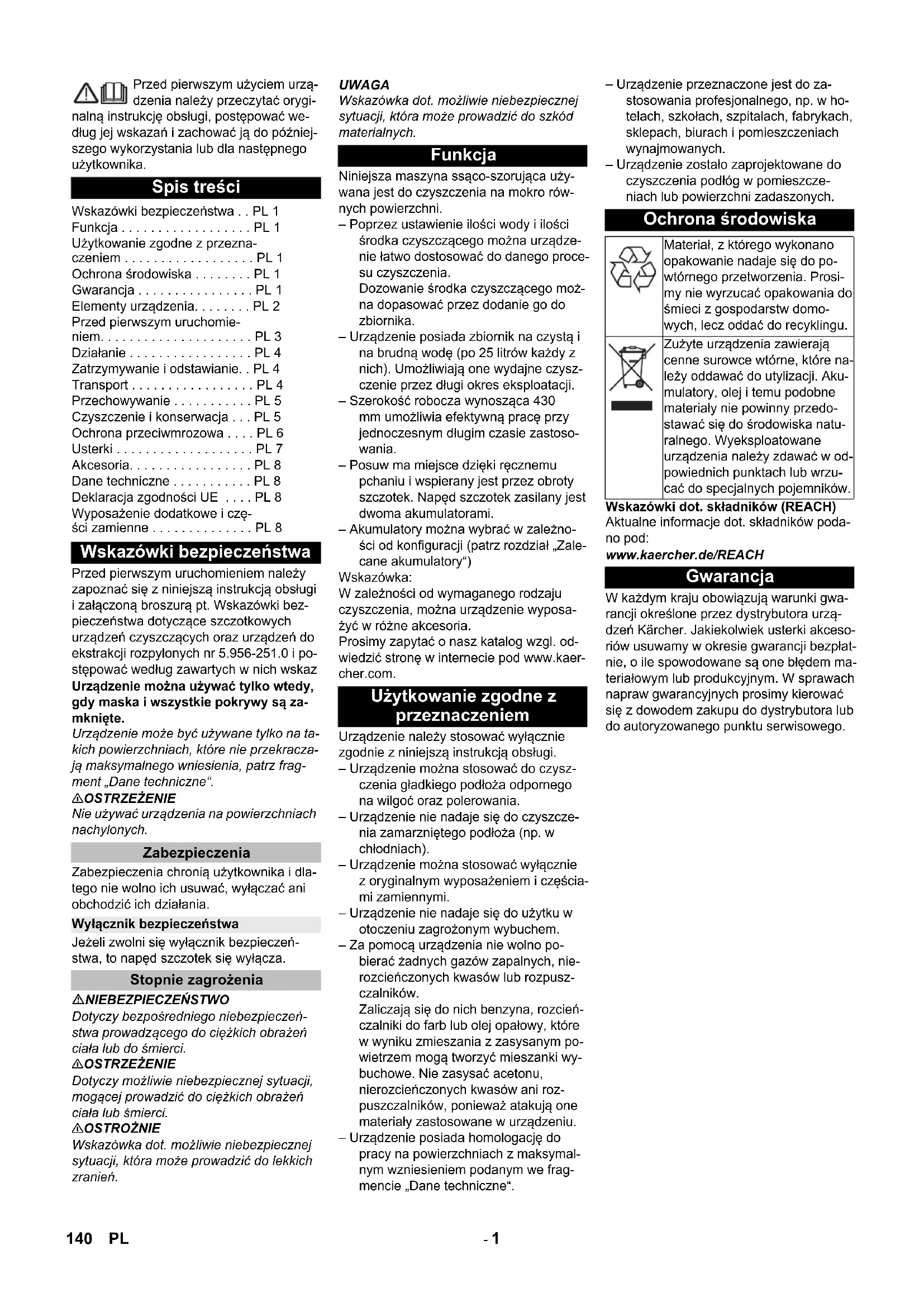 Pribor in nadomestni deli Chairman of the Board of Management Director Regulatory Affairs & Certification 139SL- 1 Przed pierwszym użyciem urzą- dzenia należy przeczytać orygi- nalną instrukcję obsługi, postępować we- dług jej wskazań i zachować ją do później- szego wykorzystania lub dla następnego użytkownika. Przed pierwszym uruchomieniem należy zapoznać się z niniejszą instrukcją obsługi i załączoną broszurą pt. Wskazówki bez- pieczeństwa dotyczące szczotkowych urządzeń czyszczących oraz urządzeń do ekstrakcji rozpylonych nr 5.956-251.0 i po- stępować według zawartych w nich wskaz Urządzenie można używać tylko wtedy, gdy maska i wszystkie pokrywy są za- mknięte. Urządzenie może być używane tylko na ta- kich powierzchniach, które nie przekracza- ją maksymalnego wniesienia, patrz frag- ment „Dane techniczne“. 몇 OSTRZEŻENIE Nie używać urządzenia na powierzchniach nachylonych. Zabezpieczenia chronią użytkownika i dla- tego nie wolno ich usuwać, wyłączać ani obchodzić ich działania. Jeżeli zwolni się wyłącznik bezpieczeń- stwa, to napęd szczotek się wyłącza. NIEBEZPIECZEŃSTWO Dotyczy bezpośredniego niebezpieczeń- stwa prowadzącego do ciężkich obrażeń ciała lub do śmierci. 몇 OSTRZEŻENIE Dotyczy możliwie niebezpiecznej sytuacji, mogącej prowadzić do ciężkich obrażeń ciała lub śmierci. 몇 OSTROŻNIE Wskazówka dot. moż liwie niebezpiecznej sytuacji, która może prowadzić do lekkich zranień. UWAGA Wskazówka dot. możliwie niebezpiecznej sytuacji, która może prowadzić do szkód materialnych. Niniejsza maszyna ssąco-szorująca uży- wana jest do czyszczenia na mokro rów- nych powierzchni. – Poprzez ustawienie ilości wody i ilości środka czyszczącego można urządze- nie łatwo dostosować do danego proce- su czyszczenia. Dozowanie środka czyszczącego moż- na dopasować przez dodanie go do zbiornika. – Urządzenie posiada zbiornik na czystą i na brudną wodę (po 25 litrów każdy z nich). Umożliwiają one wydajne czysz- czenie przez długi okres eksploatacji. – Szerokość robocza wynosząca 430 mm umożliwia efektywną pracę przy jednoczesnym długim czasie zastoso- wania. – Posuw ma miejsce dzięki ręcznemu pchaniu i wspierany jest przez obroty szczotek. Napęd szczotek zasilany jest dwoma akumulatorami. – Akumulatory można wybrać w zależno- ści od konfiguracji (patrz rozdział „Zale- cane akumulatory“) Wskazówka: W zależności od wymaganego rodzaju czyszczenia, można urządzenie wyposa- żyć w różne akcesoria. Prosimy zapytać o nasz katalog wzgl. od- wiedzić stronę w internecie pod www.kaer- cher.com. Urządzenie należy stosować wyłącznie zgodnie z niniejszą instrukcją obsługi. – Urządzenie można stosować do czysz- czenia gładkiego podłoża odpornego na wilgoć oraz polerowania. – Urządzenie nie nadaje się do czyszcze- nia zamarzniętego podłoża (np. w chłodniach). – Urządzenie można stosować wyłącznie z oryginalnym wyposażeniem i częścia- mi zamiennymi. – Urządzenie nie nadaje się do użytku w otoczeniu zagrożonym wybuchem. – Za pomocą urządzenia nie wolno po- bierać żadnych gazów zapalnych, nie- rozcieńczonych kwasów lub rozpusz- czalników. Zaliczają się do nich benzyna, rozcień- czalniki do farb lub olej opałowy, które w wyniku zmieszania z zasysanym po- wietrzem mogą tworzyć mieszanki wy- buchowe. Nie zasysać acetonu, nierozcieńczonych kwasów ani roz- puszczalników, ponieważ atakują one materiały zastosowane w urządzeniu. – Urządzenie posiada homologację do pracy na powierzchniach z maksymal- nym wzniesieniem podanym we frag- mencie „Dane techniczne“. – Urządzenie przeznaczone jest do za- stosowania profesjonalnego, np. w ho- telach, szkołach, szpitalach, fabrykach, sklepach, biurach i pomieszczeniach wynajmowanych. – Urządzenie zostało zaprojektowane do czyszczenia podłóg w pomieszcze- niach lub powierzchni zadaszonych. Wskazówki dot. składników (REACH) Aktualne informacje dot. składników poda- no pod: www.kaercher.de/REACH W każdym kraju obowiązują warunki gwa- rancji określone przez dystrybutora urzą- dzeń Kärcher. Jakiekolwiek usterki akceso- riów usuwamy w okresie gwarancji bezpłat- nie, o ile spowodowane są one błędem ma- teriałowym lub produkcyjnym. W sprawach napraw gwarancyjnych prosimy kierować się z dowodem zakupu do dystrybutora lub do autoryzowanego punktu serwisowego. Spis treści Wskazówki bezpieczeństwa . . PL 1 Funkcja . . . . . . . . . . . . . . . . . . PL 1 Użytkowanie zgodne z przezna- czeniem . . . . . . . . . . . . . . . . . . PL 1 Ochrona środowiska . . . . . . . . PL 1 Gwarancja . . . . . . . . . . . . . . . . PL 1 Elementy urządzenia. . . . . . . . PL 2 Przed pierwszym uruchomie- niem. . . . . . . . . . . . . . . . . . . . . PL 3 Działanie . . . . . . . . . . . . . . . . . PL 4 Zatrzymywanie i odstawianie. . PL 4 Transport . . . . . . . . . . . . . . . . . PL 4 Przechowywanie . . . . . . . . . . . PL 5 Czyszczenie i konserwacja . . . PL 5 Ochrona przeciwmrozowa . . . . PL 6 Usterki . . . . . . . . . . . . . . . . . . . PL 7 Akcesoria. . . . . . . . . . . . . . . . . PL 8 Dane techniczne . . . . . . . . . . . PL 8 Deklaracja zgodności UE . . . . PL 8 Wyposażenie dodatkowe i czę- ści zamienne . . . . . . . . . . . . . . PL 8 Wskazówki bezpieczeństwa Zabezpieczenia Wyłącznik bezpieczeństwa Stopnie zagrożenia Funkcja Użytkowanie zgodne z przeznaczeniem Ochrona środowiska Materiał, z którego wykonano opakowanie nadaje się do po- wtórnego przetworzenia. Prosi- my nie wyrzucać opakowania do śmieci z gospodarstw domo- wych, lecz oddać do recyklingu. Zużyte urządzenia zawierają cenne surowce wtórne, które na- leży oddawać do utylizacji. Aku- mulatory, olej i temu podobne materiały nie powinny przedo- stawać się do środowiska natu- ralnego. Wyeksploatowane urządzenia należy zdawać w od- powied
