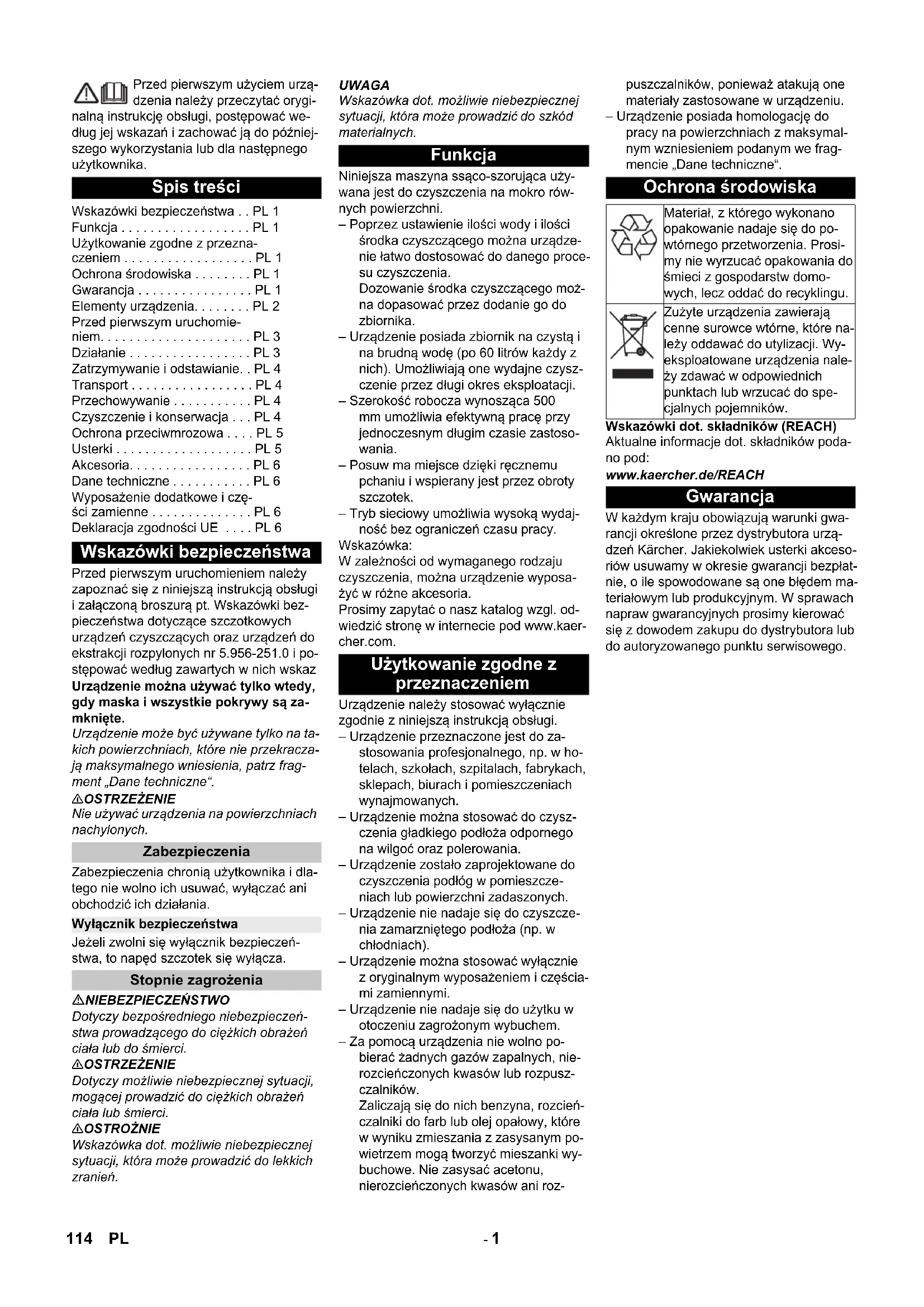 Chairman of the Board of Management Director Regulatory Affairs & Certification 113SL- 1 Przed pierwszym użyciem urzą- dzenia należy przeczytać orygi- nalną instrukcję obsługi, postępować we- dług jej wskazań i zachować ją do później- szego wykorzystania lub dla następnego użytkownika. Przed pierwszym uruchomieniem należy zapoznać się z niniejszą instrukcją obsługi i załączoną broszurą pt. Wskazówki bez- pieczeństwa dotyczące szczotkowych urządzeń czyszczących oraz urządzeń do ekstrakcji rozpylonych nr 5.956-251.0 i po- stępować według zawartych w nich wskaz Urządzenie można używać tylko wtedy, gdy maska i wszystkie pokrywy są za- mknięte. Urządzenie może być używane tylko na ta- kich powierzchniach, które nie przekracza- ją maksymalnego wniesienia, patrz frag- ment „Dane techniczne“. 몇 OSTRZEŻENIE Nie używać urządzenia na powierzchniach nachylonych. Zabezpieczenia chronią użytkownika i dla- tego nie wolno ich usuwać, wyłączać ani obchodzić ich działania. Jeżeli zwolni się wyłącznik bezpieczeń- stwa, to napęd szczotek się wyłącza. NIEBEZPIECZEŃSTWO Dotyczy bezpośredniego niebezpieczeń- stwa prowadzącego do ciężkich obrażeń ciała lub do śmierci. 몇 OSTRZEŻENIE Dotyczy możliwie niebezpiecznej sytuacji, mogącej prowadzić do ciężkich obrażeń ciała lub śmierci. 몇 OSTROŻNIE Wskazówka dot. możliwie niebezpiecznej sytuacji, która może prowadzić do lekkich zranień. UWAGA Wskazówka dot. możliwie niebezpiecznej sytuacji, która może prowadzić do szkód materialnych. Niniejsza maszyna ssąco-szorująca uży- wana jest do czyszczenia na mokro rów- nych powierzchni. – Poprzez ustawienie ilości wody i ilości środka czyszczącego można urządze- nie łatwo dostosować do danego proce- su czyszczenia. Dozowanie środka czyszczącego moż- na dopasować przez dodanie go do zbiornika. – Urządzenie posiada zbiornik na czystą i na brudną wodę (po 60 litrów każdy z nich). Umożliwiają one wydajne czysz- czenie przez długi okres eksploatacji. – Szerokość robocza wynosząca 500 mm umożliwia efektywną pracę przy jednoczesnym długim czasie zastoso- wania. – Posuw ma miejsce dzięki ręcznemu pchaniu i wspierany jest przez obroty szczotek. – Tryb sieciowy umożliwia wysoką wydaj- ność bez ograniczeń czasu pracy. Wskazówka: W zależności od wymaganego rodzaju czyszczenia, można urządzenie wyposa- żyć w różne akcesoria. Prosimy zapytać o nasz katalog wzgl. od- wiedzić stronę w internecie pod www.kaer- cher.com. Urządzenie należy stosować wyłącznie zgodnie z niniejszą instrukcją obsługi. – Urządzenie przeznaczone jest do za- stosowania profesjonalnego, np. w ho- telach, szkołach, szpitalach, fabrykach, sklepach, biurach i pomieszczeniach wynajmowanych. – Urządzenie można stosować do czysz- czenia gładkiego podłoża odpornego na wilgoć oraz polerowania. – Urządzenie zostało zaprojektowane do czyszczenia podłóg w pomieszcze- niach lub powierzchni zadaszonych. – Urządzenie nie nadaje się do czyszcze- nia zamarzniętego podłoża (np. w chłodniach). – Urządzenie można stosować wyłącznie z oryginalnym wyposażeniem i częścia- mi zamiennymi. – Urządzenie nie nadaje się do użytku w otoczeniu zagrożonym wybuchem. – Za pomocą urządzenia nie wolno po- bierać żadnych gazów zapalnych, nie- rozcieńczonych kwasów lub rozpusz- czalników. Zaliczają się do nich benzyna, rozcień- czalniki do farb lub olej opałowy, które w wyniku zmieszania z zasysanym po- wietrzem mogą tworzyć mieszanki wy- buchowe. Nie zasysać acetonu, nierozcieńczonych kwasów ani roz- puszczalników, ponieważ atakują one materiały zastosowane w urządzeniu. – Urządzenie posiada homologację do pracy na powierzchniach z maksymal- nym wzniesieniem podanym we frag- mencie „Dane techniczne“. Wskazówki dot. składników (REACH) Aktualne informacje dot. składników poda- no pod: www.kaercher.de/REACH W każdym kraju obowiązują warunki gwa- rancji określone przez dystrybutora urzą- dzeń Kärcher. Jakiekolwiek usterki akceso- riów usuwamy w okresie gwarancji bezpłat- nie, o ile spowodowane są one błędem ma- teriałowym lub produkcyjnym. W sprawach napraw gwarancyjnych prosimy kierować się z dowodem zakupu do dystrybutora lub do autoryzowanego punktu serwisowego. Spis treści Wskazówki bezpieczeństwa . . PL 1 Funkcja . . . . . . . . . . . . . . . . . . PL 1 Użytkowanie zgodne z przezna- czeniem . . . . . . . . . . . . . . . . . . PL 1 Ochrona środowiska . . . . . . . . PL 1 Gwarancja . . . . . . . . . . . . . . . . PL 1 Elementy urządzenia. . . . . . . . PL 2 Przed pierwszym uruchomie- niem. . . . . . . . . . . . . . . . . . . . . PL 3 Działanie . . . . . . . . . . . . . . . . . PL 3 Zatrzymywanie i odstawianie. . PL 4 Transport . . . . . . . . . . . . . . . . . PL 4 Przechowywanie . . . . . . . . . . . PL 4 Czyszczenie i konserwacja . . . PL 4 Ochrona przeciwmrozowa . . . . PL 5 Usterki . . . . . . . . . . . . . . . . . . . PL 5 Akcesoria. . . . . . . . . . . . . . . . . PL 6 Dane techniczne . . . . . . . . . . . PL 6 Wyposażenie dodatkowe i czę- ści zamienne . . . . . . . . . . . . . . PL 6 Deklaracja zgodności UE . . . . PL 6 Wskazówki bezpieczeństwa Zabezpieczenia Wyłącznik bezpieczeństwa Stopnie zagrożenia Funkcja Użytkowanie zgodne z przeznaczeniem Ochrona środowiska Materiał, z którego wykonano opakowanie nadaje się do po- wtórnego przetworzenia. Prosi- my nie wyrzucać opakowania do śmieci z gospodarstw domo- wych, lecz oddać do recyklingu. Zużyte urządzenia zawierają cenne surowce wtórne, które na- leży oddawać do utylizacji. Wy- eksploatowane urządzenia nale- ży zdawać w odpowiednich punktach lub wrzucać do spe- cjalnych pojemników. Gwarancja 114 PL- 2 1 Sito 2 Wyłącznik bezpieczeństwa 3 Wąż spustowy brudnej wody z urządze- niem dozującym 4 Szyna unieruchamiająca Homebase 5 Pływak