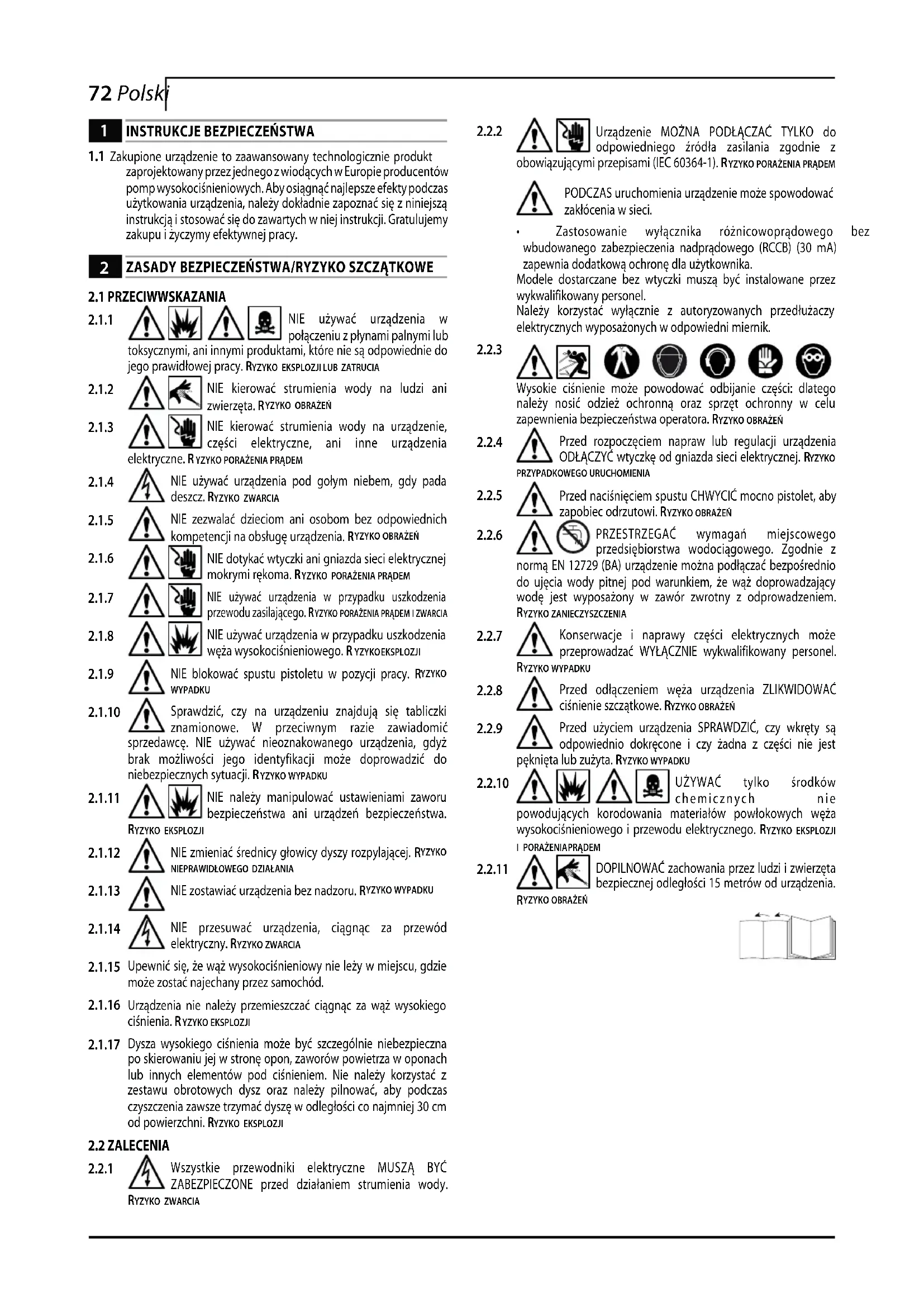 Wszystkie przewodniki elektryczne MUSZĄ BYĆ ZABEZPIECZONE przed działaniem strumienia wody. YZYKO ZWARCIA Urządzenie MOŻNA PODŁĄCZAĆ TYLKO do odpowiedniego źródła zasilania zgodnie z obowiązującymi przepisami (IEC 60364-1). RYZYKO PORAŻENIA PRĄDEMPODCZAS uruchomienia urządzenie może spowodować zakłócenia w sieci.• Zastosowanie wyłącznika różnicowoprądowego bez wbudowanego zabezpieczenia nadprądowego (RCCB) (30 mA) zapewnia dodatkową ochronę dla użytkownika.Modele dostarczane bez wtyczki muszą być instalowane przez wykwalifikowany personel.Należy korzystać wyłącznie z autoryzowanych przedłużaczy elektrycznych wyposażonych w odpowiedni miernik. Wysokie ciśnienie może powodować odbijanie części: dlatego należy nosić odzież ochronną oraz sprzęt ochronny w celu zapewnienia bezpieczeństwa operatora. RYZYKO OBRAŻEŃ Przed rozpoczęciem napraw lub regulacji urządzenia ODŁĄCZYĆ wtyczkę od gniazda sieci elektrycznej. RYZYKO PRZYPADKOWEGO URUCHOMIENIA Przed naciśnięciem spustu CHWYCIĆ mocno pistolet, aby zapobiec odrzutowi. RYZYKO OBRAŻEŃ PRZESTRZEGAĆ wymagań miejscowego przedsiębiorstwa wodociągowego. Zgodnie z normą EN 12729 (BA) urządzenie można podłączać bezpośrednio do ujęcia wody pitnej pod warunkiem, że wąż doprowadzający wodę jest wyposażony w zawór zwrotny z odprowadzeniem. YZYKO ZANIECZYSZCZENIA Konserwacje i naprawy części elektrycznych może przeprowadzać WYŁĄCZNIE wykwalifikowany personel. YZYKO WYPADKU Przed odłączeniem węża urządzenia ZLIKWIDOWAĆ ciśnienie szczątkowe. RYZYKO OBRAŻEŃ Przed użyciem urządzenia SPRAWDZIĆ, czy wkręty są odpowiednio dokręcone i czy żadna z części nie jest pęknięta lub zużyta. RYZYKO WYPADKU UŻYWAĆ tylko środków chemicznych nie powodujących korodowania materiałów powłokowych węża wysokociśnieniowego i przewodu elektrycznego. RYZYKO EKSPLOZJI