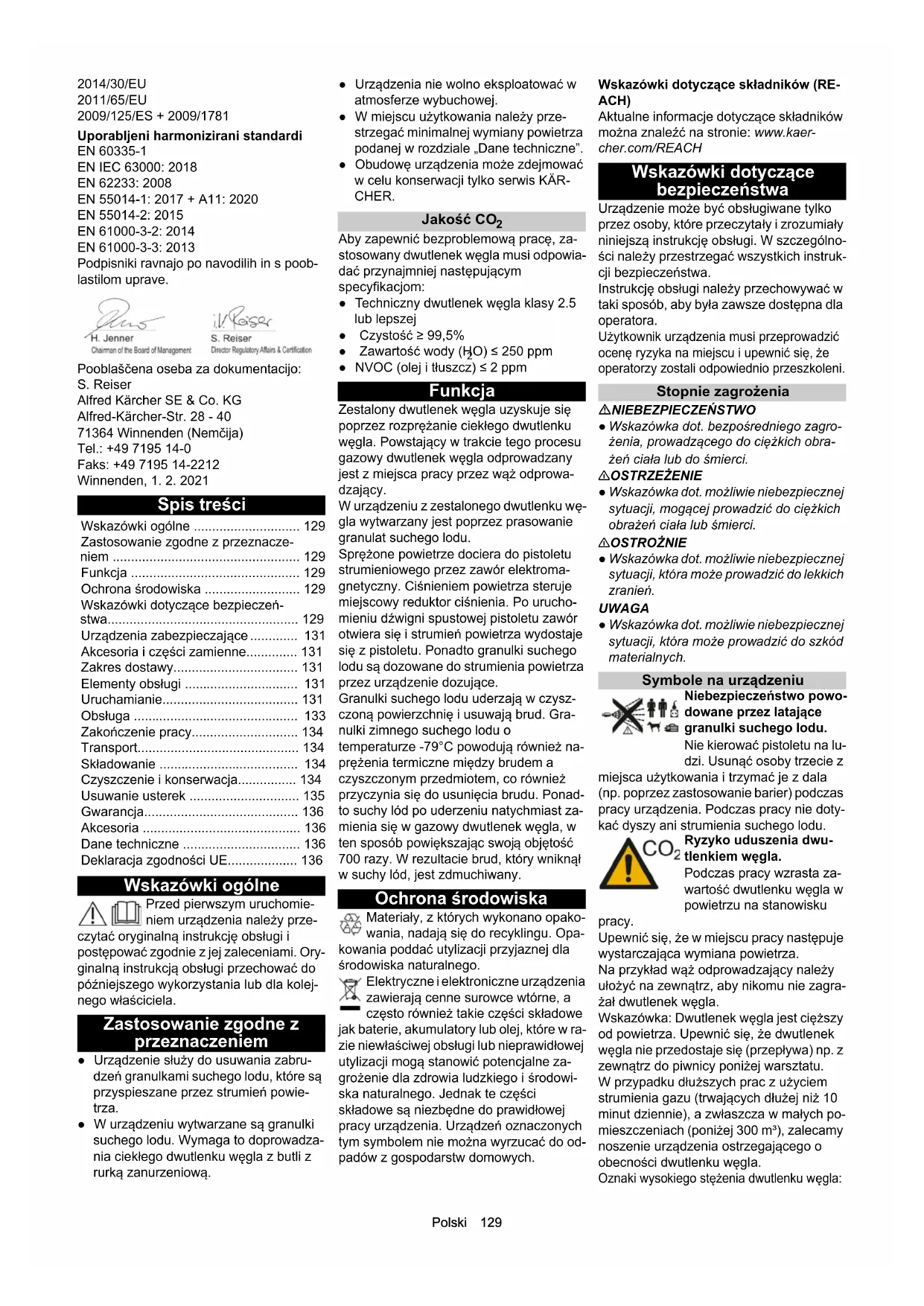 /h 2000 Mere in mase Tipična obratovalna teža (brez jeklenke z ogljikovim dioksidom) kg 95 Dolžina mm 866 Širina mm 443 Višina brez jeklenke z oglji- kovim dioksidom mm 970 Ugotovljene vrednosti v skladu s stan- dardom EN 60335-2-79 Vrednost tresljajev za dla- ni/roke m/s2 0,08 Raven tlaka hrupa dB(A) 95 Raven moči hrupa LWA + negotovost KWA dB(A) 115 IB 10/ 8 L2PPolski 129 2014/30/EU 2011/65/EU 2009/125/ES + 2009/1781 Uporabljeni harmonizirani standardi EN 60335-1 EN IEC 63000: 2018 EN 62233: 2008 EN 55014-1: 2017 + A11: 2020 EN 55014-2: 2015 EN 61000-3-2: 2014 EN 61000-3-3: 2013 Podpisniki ravnajo po navodilih in s poob- lastilom uprave. Pooblaščena oseba za dokumentacijo: S. Reiser Alfred Kärcher SE & Co. KG Alfred-Kärcher-Str. 28 - 40 71364 Winnenden (Nemčija) Tel.: +49 7195 14-0 Faks: +49 7195 14-2212 Winnenden, 1. 2. 2021 Spis treści Wskazówki ogólne Przed pierwszym uruchomie- niem urządzenia należy prze- czytać oryginalną instrukcję obsługi i postępować zgodnie z jej zaleceniami. Ory- ginalną instrukcją obsługi przechować do późniejszego wykorzystania lub dla kolej- nego właściciela. Zastosowanie zgodne z przeznaczeniem ● Urządzenie służy do usuwania zabru- dzeń granulkami suchego lodu, które są przyspieszane przez strumień powie- trza. ● W urządzeniu wytwarzane są granulki suchego lodu. Wymaga to doprowadza- nia ciekłego dwutlenku węgla z butli z rurką zanurzeniową. ● Urządzenia nie wolno eksploatować w atmosferze wybuchowej. ● W miejscu użytkowania należy prze- strzegać minimalnej wymiany powietrza podanej w rozdziale „Dane techniczne”. ● Obudowę urządzenia może zdejmować w celu konserwacji tylko serwis KÄR- CHER. Jakość CO