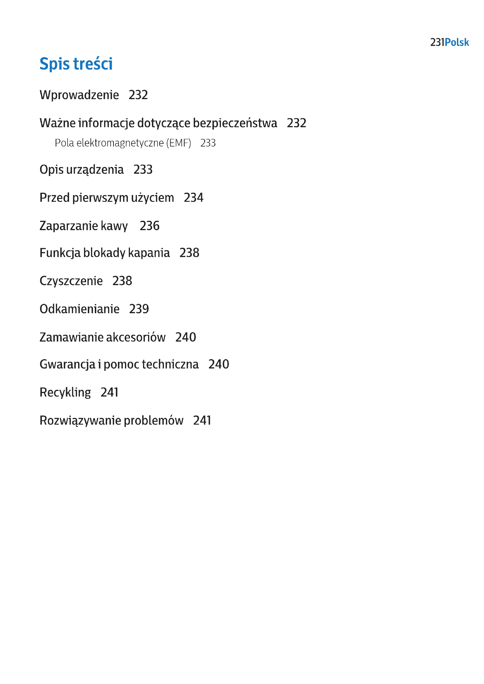 - Hvis du fjerner kannen fra apparatet i mer enn 20 sekunder i lØpet av traktingen, vil lteret renne over. 230 NorskSpis treści Wprowadzenie 232 Ważne informacje dotyczące bezpieczeństwa 232 Pola elektromagnetyczne (EMF) 233 Opis urządzenia 233 Przed pierwszym użyciem 234 Zaparzanie kawy 236 Funkcja blokady kapania 238 Czyszczenie 238 Odkamienianie 239 Zamawianie akcesoriów 240 Gwarancja i pomoc techniczna 240 Recykling 241 Rozwiązywanie problemów 241 231PolskiWprowadzenie Gratulujemy zakupu i witamy w gronie użytkowników produktów Philips! Aby w pełni skorzystać z oferowanej przez rmę Philips pomocy, zarejestruj swój produkt na stronie www.philips.com/welcome. Ważne informacje dotyczące bezpieczeństwa Zanim rozpoczniesz korzystanie z urządzenia, zapoznaj się dokładnie z podanymi informacjami, które mogą być przydatne również w późniejszej eksploatacji. Niebezpieczeństwo - Nigdy nie zanurzaj urządzenia w wodzie ani innym płynie. Ostrzeżenie - Przed podłączeniem urządzenia upewnij się, że napięcie podane na urządzeniu jest zgodne z napięciem w sieci elektrycznej. - Podłączaj urządzenie do uziemionego gniazdka elektrycznego. - Nie używaj urządzenia, jeśli uszkodzona jest wtyczka, przewód sieciowy lub samo urządzenie. - Ze względów bezpieczeństwa wymianę uszkodzonego przewodu sieciowego należy zlecić autoryzowanemu centrum serwisowemu rmy Philips lub odpowiednio wykwalikowanej osobie. - Urządzenie może być używane przez dzieci w wieku powyżej 8 lat oraz osoby z ograniczonymi zdolnościami zycznymi, sensorycznymi lub umysłowymi, a także nieposiadające wiedzy lub doświadczenia w zakresie użytkowania tego typu urządzeń, pod warunkiem, że będą nadzorowane lub zostaną poinstruowane w zakresie korzystania z urządzenia w bezpieczny sposób oraz zostaną poinformowane o potencjalnych zagrożeniach. Dzieci mogą czyścić i konserwować urządzenie, o ile ukończyły 8 lat i są nadzorowane. Przechowuj urządzenie oraz przewód sieciowy poza zasięgiem dzieci poniżej 8 roku życia. - Dzieci nie powinny bawić się urządzeniem. - Nie pozostawiaj przewodu sieciowego wiszącego ze stołu lub blatu kuchennego, na którym umieszczono urządzenie. - Korzystaj z tego urządzenia tylko zgodnie z jego przeznaczeniem, aby uniknąć potencjalnych zagrożeń i ryzyka obrażeń. Przestroga - Zawsze przed pierwszym użyciem urządzenia przepłucz je świeżą wodą. - Nie stawiaj urządzenia na rozgrzanej powierzchni i nie dopuszczaj do zetknięcia się przewodu sieciowego z rozgrzanymi powierzchniami. - Podczas użytkowania urządzenie nie może znajdować się w szafce. - Wyjmij wtyczkę z gniazdka elektrycznego przed czyszczeniem urządzenia oraz w przypadku wystąpienia problemów podczas parzenia kawy. - Podczas parzenia kawy oraz do momentu wyłączenia urządzenia uchwyt ltra, dolna część urządzenia, płytka grzejna i dzbanek z kawą są gorące. - Nie umieszczaj dzbanka na kuchence ani w mikrofalówce w celu ponownego podgrzania kawy. - To urządzenie jest przeznaczone do użytku w domach i podobnych miejscach, takich jak domy wiejskie, pensjonaty, kuchnie dla pracowników w sklepach, biurach i innych miejscach pracy, oraz do użytku przez gości hoteli, moteli itp. 232 Polski- Konieczność przeglądu lub naprawy urządzenia zawsze zgłaszaj do autoryzowanego centrum serwisowego rmy Philips. Nie należy otwierać urządzenia ani podejmować prób samodzielnej naprawy urządzenia. Pola elektromagnetyczne (EMF) To urządzenie rmy Philips spełnia wszystkie normy i jest zgodne ze wszystkimi przepisami dotyczącymi ekspozycji na działanie pól elektromagnetycznych. Opis urządzenia 1 Filtr 2 Korpus ltra 3 Pokrywka dzbanka 4 Szklany dzbanek 5 Płytka grzejna 6 Wyłącznik 7 Zbiornik wody 8 Pokrywka ltra 9 Pokrywka zbiornika wody