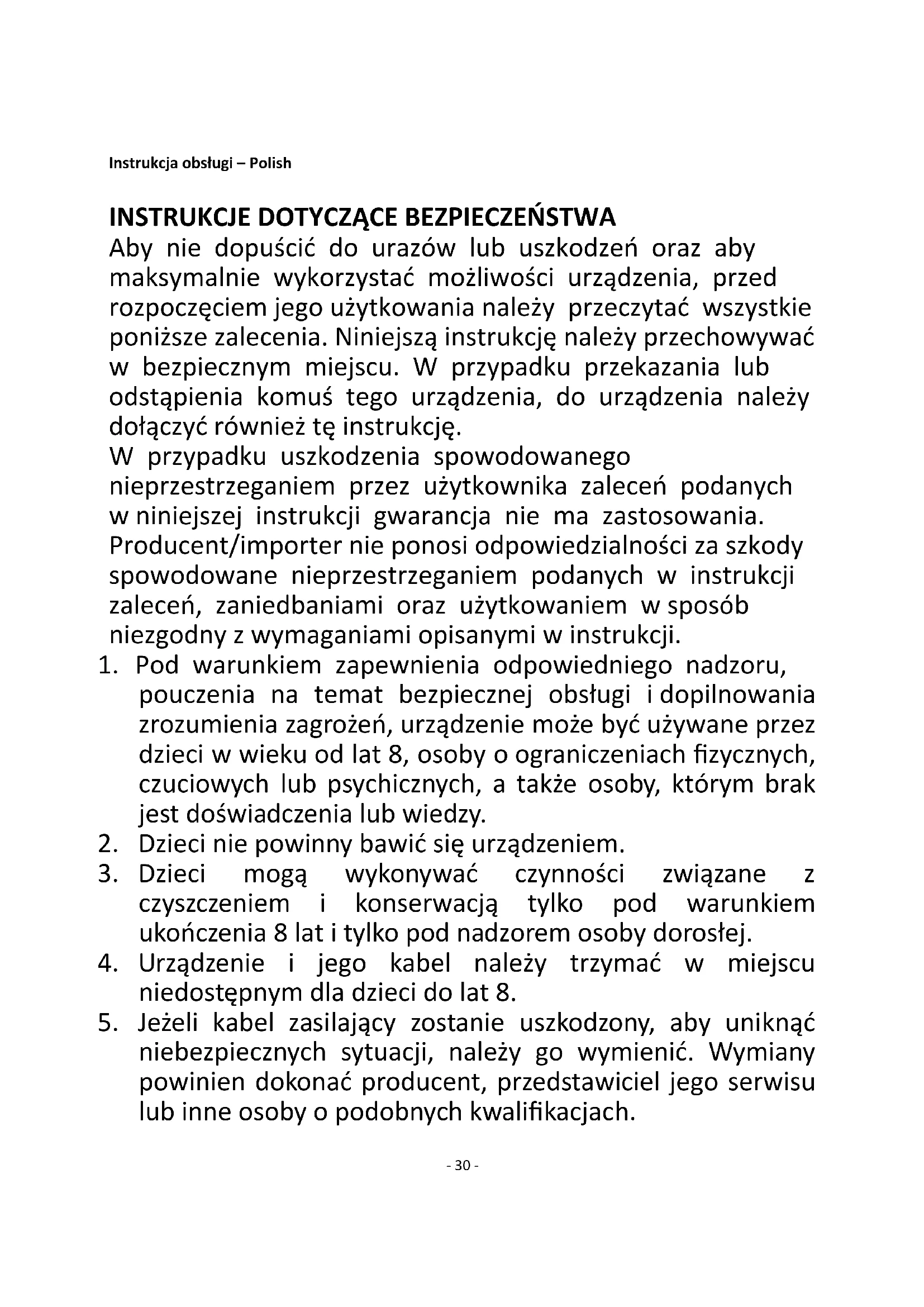 Aby nie dopuścić do urazów lub uszkodzeń oraz aby maksymalnie wykorzystać możliwości urządzenia, przed rozpoczęciem jego użytkowania należy przeczytać wszystkie poniższe zalecenia. Niniejszą instrukcję należy przechowywać w bezpiecznym miejscu. W przypadku przekazania lub odstąpienia komuś tego urządzenia, do urządzenia należy dołączyć również tę instrukcję. W przypadku uszkodzenia spowodowanego nieprzestrzeganiem przez użytkownika zaleceń podanych w niniejszej instrukcji gwarancja nie ma zastosowania. Producent/importer nie ponosi odpowiedzialności za szkody spowodowane nieprzestrzeganiem podanych w instrukcji zaleceń, zaniedbaniami oraz użytkowaniem w sposób niezgodny z wymaganiami opisanymi w instrukcji.
