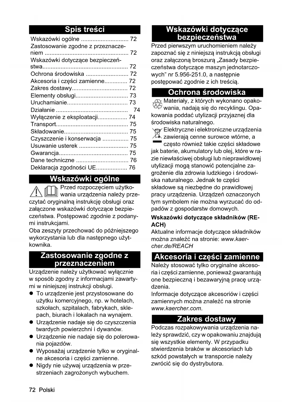 - dB(A) 77,272 Polski Spis treści Wskazówki ogólne Przed rozpoczęciem użytko- wania urządzenia należy prze- czytać oryginalną instrukcję obsługi oraz załączone wskazówki dotyczące bezpie- czeństwa. Postępować zgodnie z podany- mi instrukcjami. Oba zeszyty przechować do późniejszego wykorzystania lub dla następnego użyt- kownika. Zastosowanie zgodne z przeznaczeniem Urządzenie należy użytkować wyłącznie w sposób zgodny z informacjami zawarty- mi w niniejszej instrukcji obsługi. To urządzenie jest przystosowane do użytku komercyjnego, np. w hotelach, szkołach, szpitalach, fabrykach, skle- pach, biurach i lokalach na wynajem. Urządzenie nadaje się do czyszczenia twardych powierzchni i dywanów. Urządzenie nie nadaje się do polerowa- nia pojazdów. Wyposażaj urządzenie tylko w oryginal- ne akcesoria i części zamienne. Nigdy nie używaj urządzenia w prze- strzeniach zagrożonych wybuchem. Wskazówki dotyczące bezpieczeństwa Przed pierwszym uruchomieniem należy zapoznać się z niniejszą instrukcją obsługi oraz załączoną broszurą „Zasady bezpie- czeństwa dotyczące maszyn jednotarczo- wych” nr 5.956-251.0, a następnie postępować zgodnie z ich treścią. Ochrona środowiska Materiały, z których wykonano opako- wania, nadają się do recyklingu. Opa- kowania poddać utylizacji przyjaznej dla środowiska naturalnego. Elektryczne i elektroniczne urządzenia zawierają cenne surowce wtórne, a często również takie części składowe jak baterie, akumulatory lub olej, które w ra- zie niewłaściwej obsługi lub nieprawidłowej utylizacji mogą stanowić potencjalne za- grożenie dla zdrowia ludzkiego i środowi- ska naturalnego. Jednak te części składowe są niezbędne do prawidłowej pracy urządzenia. Urządzeń oznaczonych tym symbolem nie można wyrzucać do od- padów z gospodarstw domowych. Wskazówki dotyczące składników (RE- ACH) Aktualne informacje dotyczące składników można znaleźć na stronie: www.kaer- cher.de/REACH Akcesoria i części zamienne Należy stosować tylko oryginalne akceso- ria i części zamienne, ponieważ gwarantują one bezpieczną i bezawaryjną pracę urzą- dzenia. Informacje dotyczące akcesoriów i części zamiennych można znaleźć na stronie www.kaercher.com. Zakres dostawy Podczas rozpakowywania urządzenia na- leży sprawdzić, czy w opakowaniu znajdują się wszystkie elementy. W przypadku stwierdzenia braków w akcesoriach lub szkód powstałych w transporcie należy zwrócić się do dystrybutora. Wskazówki ogólne p. 72