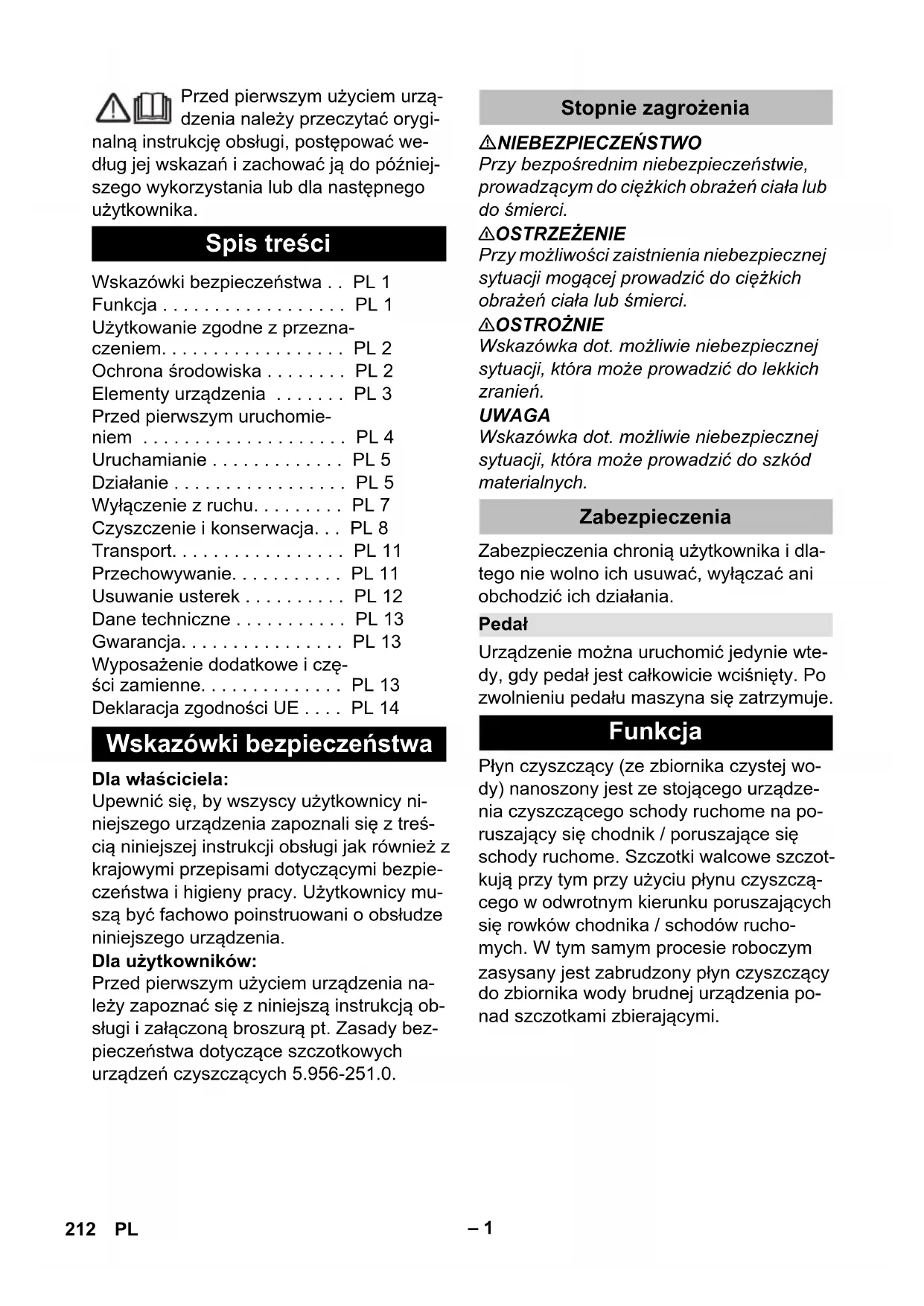 Chairman of the Board of Management Director Regulatory Affairs & Certification 211CS– 1 Przed pierwszym użyciem urzą- dzenia należy przeczytać orygi- nalną instrukcję obsługi, postępować we- dług jej wskazań i zachować ją do później- szego wykorzystania lub dla następnego użytkownika. Dla właściciela: Upewnić się, by wszyscy użytkownicy ni- niejszego urządzenia zapoznali się z treś- cią niniejszej instrukcji obsługi jak również z krajowymi przepisami dotyczącymi bezpie- czeństwa i higieny pracy. Użytkownicy mu- szą być fachowo poinstruowani o obsłudze niniejszego urządzenia. Dla użytkowników: Przed pierwszym użyciem urządzenia na- leży zapoznać się z niniejszą instrukcją ob- sługi i załączoną broszurą pt. Zasady bez- pieczeństwa dotyczące szczotkowych urządzeń czyszczących 5.956-251.0. NIEBEZPIECZEŃSTWO Przy bezpośrednim niebezpieczeństwie, prowadzącym do ciężkich obrażeń ciała lub do śmierci. 몇 OSTRZEŻENIE Przy możliwości zaistnienia niebezpiecznej sytuacji mogącej prowadzić do ciężkich obrażeń ciała lub śmierci. 몇 OSTROŻNIE Wskazówka dot. możliwie niebezpiecznej sytuacji, która może prowadzić do lekkich zranień. UWAGA Wskazówka dot. możliwie niebezpiecznej sytuacji, która może prowadzić do szkód materialnych. Zabezpieczenia chronią użytkownika i dla- tego nie wolno ich usuwać, wyłączać ani obchodzić ich działania. Urządzenie można uruchomić jedynie wte- dy, gdy pedał jest całkowicie wciśnięty. Po zwolnieniu pedału maszyna się zatrzymuje. Płyn czyszczący (ze zbiornika czystej wo- dy) nanoszony jest ze stojącego urządze- nia czyszczącego schody ruchome na po- ruszający się chodnik / poruszające się schody ruchome. Szczotki walcowe szczot- kują przy tym przy użyciu płynu czyszczą- cego w odwrotnym kierunku poruszających się rowków chodnika / schodów rucho- mych. W tym samym procesie roboczym zasysany jest zabrudzony płyn czyszczący do zbiornika wody brudnej urządzenia po- nad szczotkami zbierającymi. Spis treści Wskazówki bezpieczeństwa . . PL 1 Funkcja . . . . . . . . . . . . . . . . . . PL 1 Użytkowanie zgodne z przezna- czeniem. . . . . . . . . . . . . . . . . . PL 2 Ochrona środowiska . . . . . . . . PL 2 Elementy urządzenia . . . . . . . PL 3 Przed pierwszym uruchomie- niem . . . . . . . . . . . . . . . . . . . . PL 4 Uruchamianie . . . . . . . . . . . . . PL 5 Działanie . . . . . . . . . . . . . . . . . PL 5 Wyłączenie z ruchu. . . . . . . . . PL 7 Czyszczenie i konserwacja. . . PL 8 Transport. . . . . . . . . . . . . . . . . PL 11 Przechowywanie. . . . . . . . . . . PL 11 Usuwanie usterek . . . . . . . . . . PL 12 Dane techniczne . . . . . . . . . . . PL 13 Gwarancja. . . . . . . . . . . . . . . . PL 13 Wyposażenie dodatkowe i czę- ści zamienne. . . . . . . . . . . . . . PL 13 Deklaracja zgodności UE . . . . PL 14 Wskazówki bezpieczeństwa Stopnie zagrożenia Zabezpieczenia Pedał Funkcja 212 PL– 2 Niniejsze urządzenie przeznaczone jest do zastosowania profesjonalnego i przemysło- wego, np. w hotelach, szkołach, szpitalach, fabrykach, sklepach, biurach i pomieszcze- niach do wynajęcia. Urządzenie należy stosować wyłącznie zgodnie z niniejszą instrukcją obsługi. – Urządzenie może być używany jedynie do czyszczenia powierzchni chodników i schodów ruchomych. – Niniejsze urządzenie przeznaczone jest jedynie do użytku wewnątrz po- mieszczeń. – Kierunek ruchu urządzenia, które ma być czyszczone, trzeba ustawić w takim kierunku, by chodnik ruchomy / schody ruchome oddalały się od urządzenia. – Do czyszczenia schodów ruchomych może być używane niniejsze urządze- nie jedynie przy dolnym końcu schodów ruchomych. – Urządzenie można stosować wyłącznie z oryginalnym wyposażeniem i częścia- mi zamiennymi. Wskazówki dotyczące składników (RE- ACH) Aktualne informacje dotyczące składników znajdują się pod: www.kaercher.com/REACH Użytkowanie zgodne z przeznaczeniem Ochrona środowiska Materiał, z którego wykonano opakowanie nadaje się do po- wtórnego przetworzenia. Prosi- my nie wyrzucać opakowania do śmieci z gospodarstw domo- wych, lecz oddać do recyklingu. Zużyte urządzenia zawierają cenne surowce wtórne, które po- winny być oddawane do utyliza- cji. Akumulatory, olej i tym po- dobne substancje nie powinny przedostać się do środowiska naturalnego. Prosimy o utyliza- cję starych urządzeń w odpo- wiednich placówkach zbierają- cych surowce wtórne. 213PL– 3 1 Uchwyt do prowadzenia 2 Wąż spustowy do czystej wody 3 Wąż spustowy do brudnej wody 4 Wtyk sieciowy 5 Hak linki odciążającej 6 Pedał 7 Tylne koła z dźwignią blokującą 8 Pokrywa zbiornika brudnej wody 9 Koła przednie 10 Zbiornik brudnej wody 11 Otwór wlewu w zbiorniku czystej wodu 12 Pedał do opuszczania/podnoszenia głowicy czyszczącej 13 Dźwignia do zablokowania głowicy szczotki 1 Licznik czasu pracy 2 Wskaźnik ciśnienia tłoczenia 3 Wyłącznik główny 4 Kontrolka „Pełen zbiornik brudnej wo- dy“ 5 Kontrolka „Przeciążenie silnika szczo- tek“ Elementy urządzenia Pulpit sterowniczy 214 PL– 4 Usunąć opakowanie z wyjątkiem drew- nianej palety Wstawić uchwyt do prowadzenia do szczelin przy urządzeniu. Zamocować uchwyt do prowadzenia za pomocą 4 dołączonych w komplecie śrub. Zamocować pokrywy maskujące. Hak linki odciążającej zawiesić przy uchwycie do prowadzenia. Zamocować tylne koła, usunąć klocki drewniane do blokowania kół. Cztery oznaczone deski palety są umo- cowane śrubami. Odkręcić deski. Położyć deski na kancie palety. Ustawić deski w taki sposób, by leżały przed ko- łami urządzenia. Zamocowć deski przy pomocy śrub. Powoli przesuwać urządzenie z rampy. Wskazówka: Podczas produkcji urządzenie przepłukano środkiem przeciwdziałającym zamarzaniu. Przed pierwszym uruchomieniem należy usunąć środek przeciwdziałający zamarza- niu