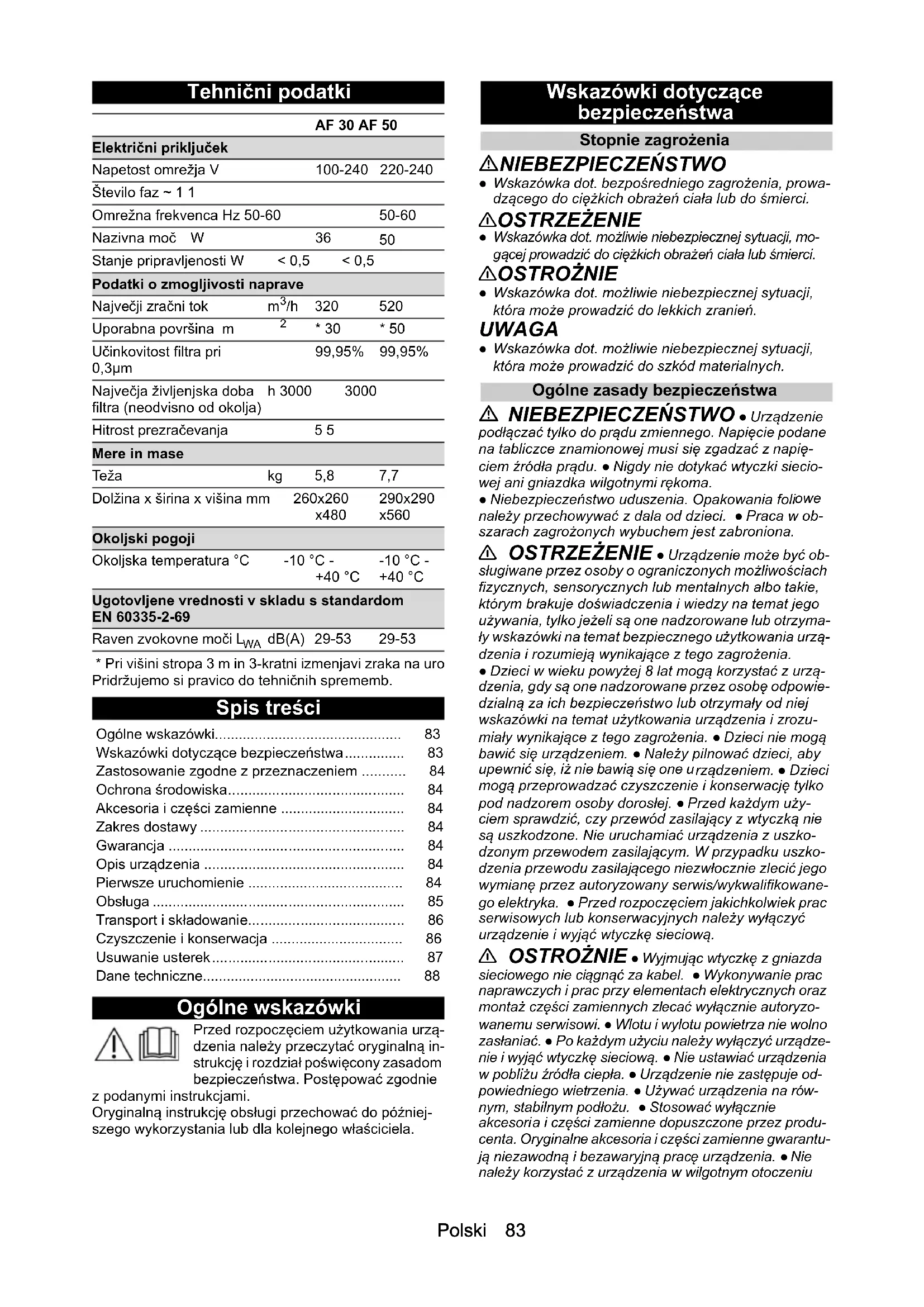 a i części zamienne dopuszczone przez produ- centa. Oryginalne akcesoria i części zamienne gwarantu- ją niezawodną i bezawaryjną pracę urządzenia. ● Nie należy korzystać z urządzenia w wilgotnym otoczeniu AF 30 AF 50 Električni priključek Napetost omrežja V 100-240 220-240 Število faz ~ 1 1 Omrežna frekvenca Hz 50-60 50-60 Nazivna moč W