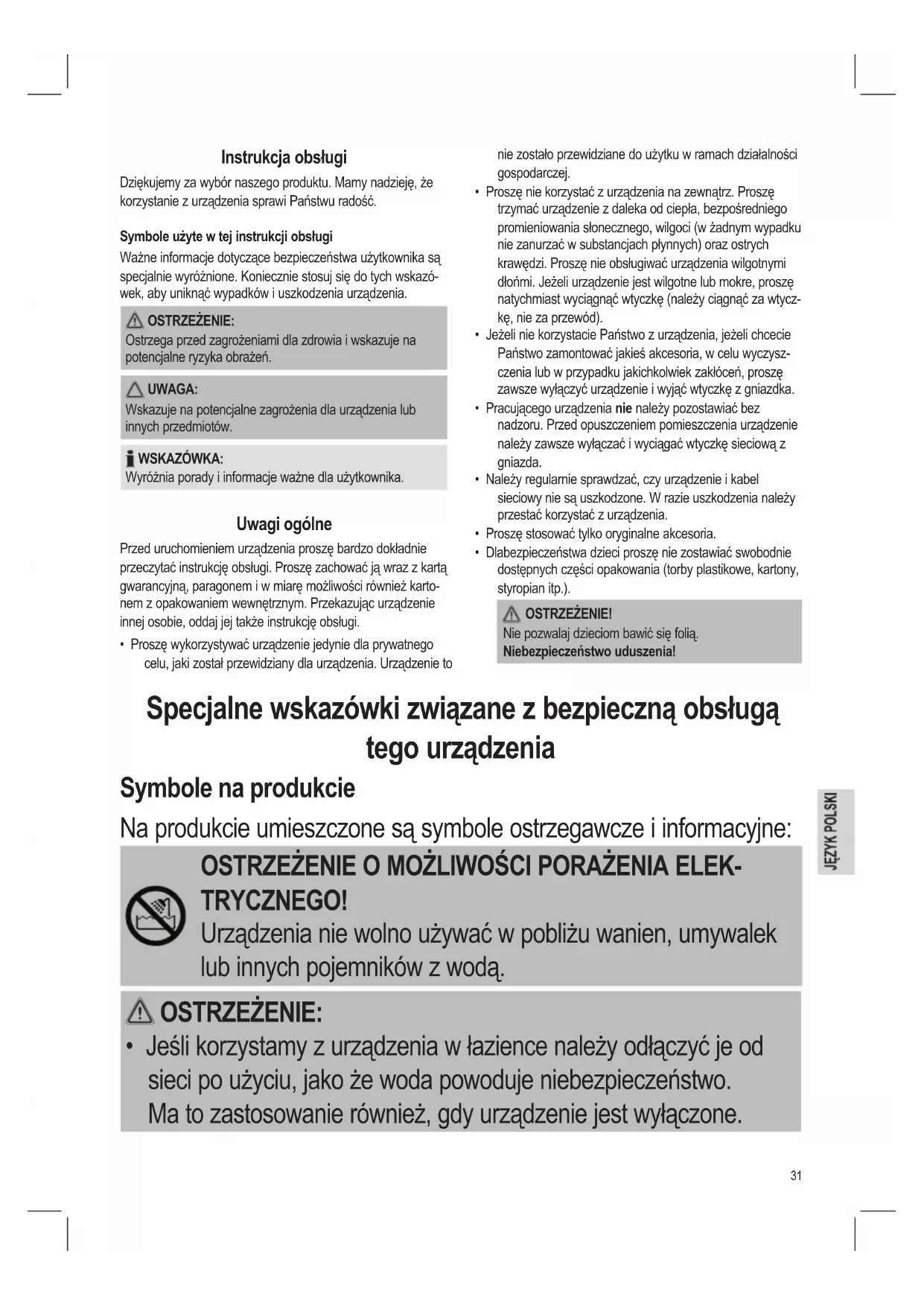 - Dlabezpieczeństwa dzieci proszę nie zostawiać swobodnie dostępnych części opakowania (torby plastikowe, kartony, styropian itp.). OSTRZEŻENIE! Nie pozwalaj dzieciom bawić się folią. Niebezpieczeństwo uduszenia! Specjalne wskazówki związane z bezpieczną obsługą tego urządzenia Symbole na produkcie Na produkcie umieszczone są symbole ostrzegawcze i informacyjne: OSTRZEŻENIE O MOŻLIWOŚCI PORAŻENIA ELEK- TRYCZNEGO! Urządzenia nie wolno używać w pobliżu wanien, umywalek lub innych pojemników z wodą. OSTRZEŻENIE: