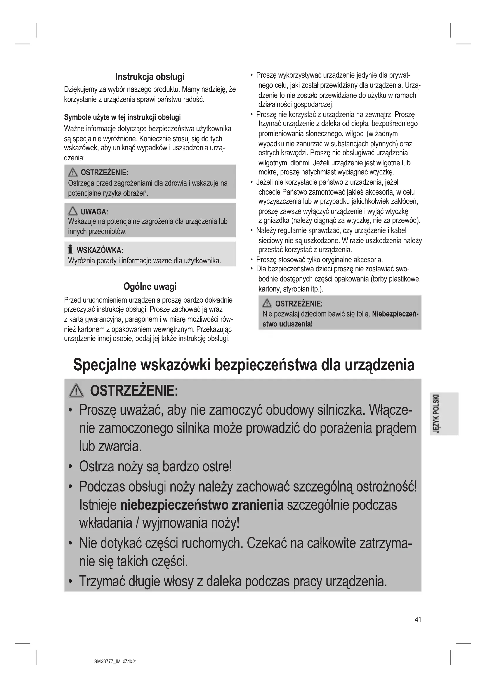 - Trzymać długie włosy z daleka podczas pracy urządzenia.SMS3777_IM 07.10.21