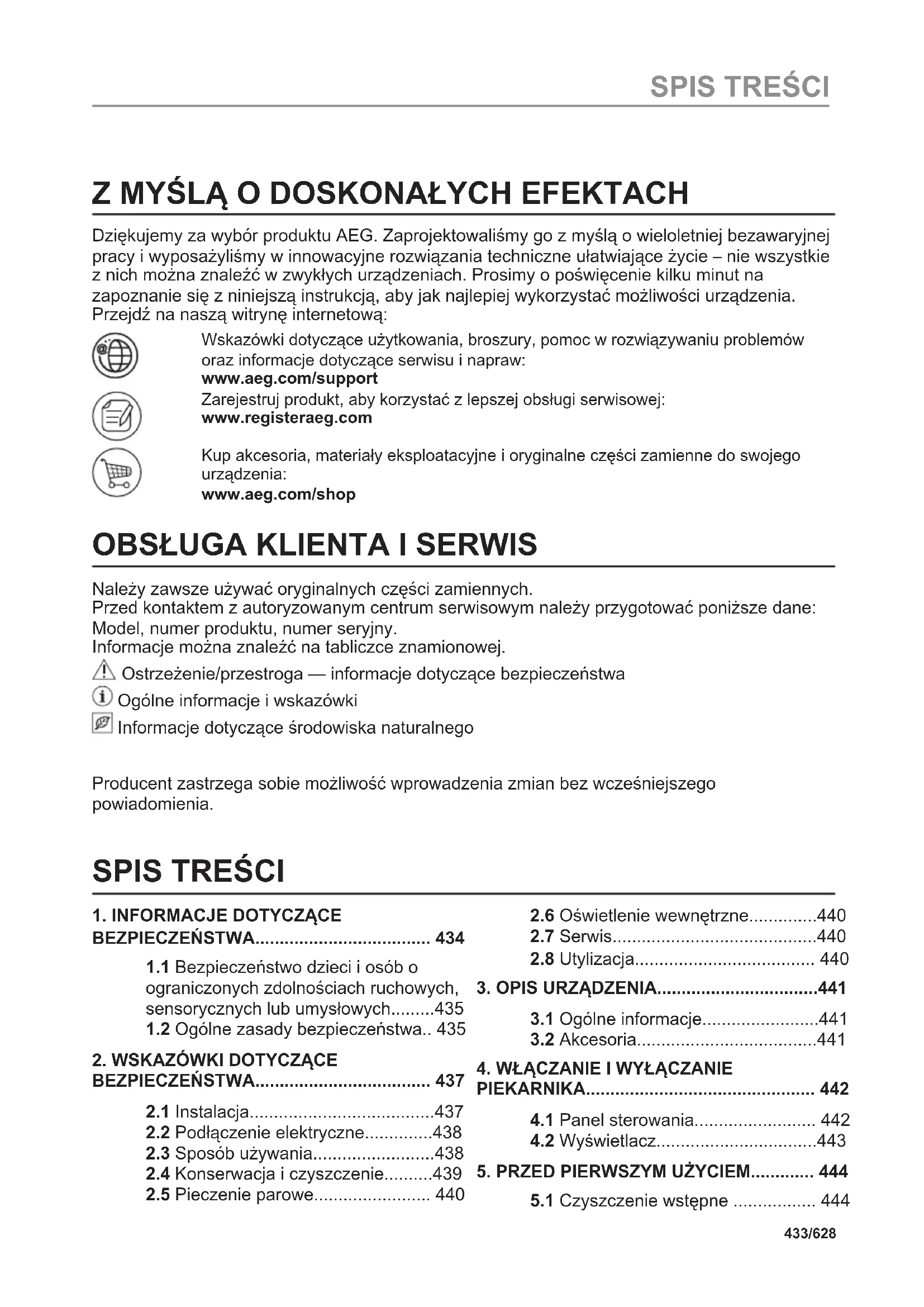 Atiduokite perdirbti medžiagas, pažymėtas šiuo ženklu . Išmeskite pakuotę į atitinkamą atliekų surinkimo konteinerį, kad ji būtų perdirbta. Padėkite saugoti aplinką bei žmonių sveikatą ir surinkti bei perdirbti elektros ir elektronikos prietaisų atliekas. Neišmeskite šiuo ženklu pažymėtų prietaisų kartu su kitomis buitinėmis atliekomis. Atiduokite šį gaminį į vietos atliekų surinkimo punktą arba susisiekite su vietos savivaldybe dėl papildomos informacijos. 432/628 PASINAUDOKITE NUORODA!Z MYŚLĄ O DOSKONAŁYCH EFEKTACH Dziękujemy za wybór produktu AEG. Zaprojektowaliśmy go z myślą o wieloletniej bezawaryjnej pracy i wyposażyliśmy w innowacyjne rozwiązania techniczne ułatwiające życie – nie wszystkie z nich można znaleźć w zwykłych urządzeniach. Prosimy o poświęcenie kilku minut na zapoznanie się z niniejszą instrukcją, aby jak najlepiej wykorzystać możliwości urządzenia. Przejdź na naszą witrynę internetową: Wskazówki dotyczące użytkowania, broszury, pomoc w rozwiązywaniu problemów oraz informacje dotyczące serwisu i napraw: www.aeg.com/support Zarejestruj produkt, aby korzystać z lepszej obsługi serwisowej: www.registeraeg.com Kup akcesoria, materiały eksploatacyjne i oryginalne części zamienne do swojego urządzenia: www.aeg.com/shop