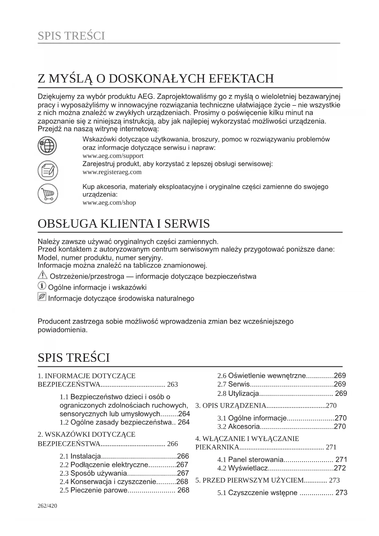 Riciclare i materiali con il simbolo . Buttare l'imballaggio negli appositi contenitori per il riciclaggio. Aiutare a proteggere l’ambiente e la salute umana e a riciclare rifiuti derivanti da apparecchiature elettriche ed elettroniche. Non smaltire le apparecchiature che riportano il simbolo insieme ai normali rifiuti domestici. Portare il prodotto al punto di riciclaggio più vicino o contattare il comune di residenza. 261/420 PRENDI UNA SCORCIATOIA!Z MYŚLĄ O DOSKONAŁYCH EFEKTACH Dziękujemy za wybór produktu AEG. Zaprojektowaliśmy go z myślą o wieloletniej bezawaryjnej pracy i wyposażyliśmy w innowacyjne rozwiązania techniczne ułatwiające życie – nie wszystkie z nich można znaleźć w zwykłych urządzeniach. Prosimy o poświęcenie kilku minut na zapoznanie się z niniejszą instrukcją, aby jak najlepiej wykorzystać możliwości urządzenia. Przejdź na naszą witrynę internetową: Wskazówki dotyczące użytkowania, broszury, pomoc w rozwiązywaniu problemów oraz informacje dotyczące serwisu i napraw: www.aeg.com/support Zarejestruj produkt, aby korzystać z lepszej obsługi serwisowej: www.registeraeg.com Kup akcesoria, materiały eksploatacyjne i oryginalne części zamienne do swojego urządzenia: www.aeg.com/shop