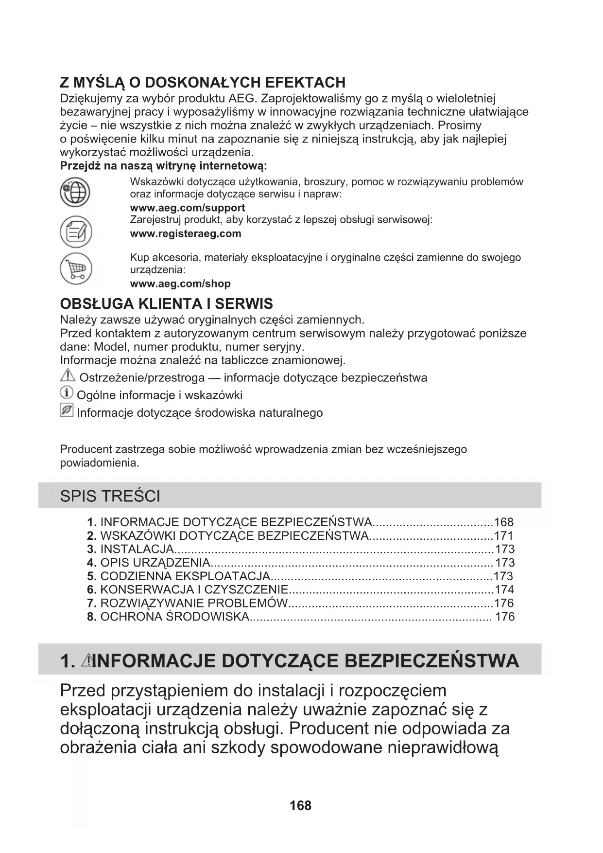 Resirkuler materialer som er merket med symbolet . Legg emballasjen i riktige beholdere for å resirkulere det. Bidrar til å beskytte miljøet, menneskers helse og for å resirkulere avfall av elektriske og elektroniske produkter. Ikke kast produkter som er merket med symbolet sammen med husholdningsavfallet. Produktet kan leveres der hvor tilsvarende produkt selges eller på miljøstasjonen i kommunen. Kontakt kommunen for nærmere opplysninger. 167Z MYŚLĄ O DOSKONAŁYCH EFEKTACH Dziękujemy za wybór produktu AEG. Zaprojektowaliśmy go z myślą o wieloletniejbezawaryjnej pracy i wyposażyliśmy w innowacyjne rozwiązania techniczne ułatwiająceżycie – nie wszystkie z nich można znaleźć w zwykłych urządzeniach. Prosimyo poświęcenie kilku minut na zapoznanie się z niniejszą instrukcją, aby jak najlepiejwykorzystać możliwości urządzenia.Przejdź na naszą witrynę internetową:Wskazówki dotyczące użytkowania, broszury, pomoc w rozwiązywaniu problemóworaz informacje dotyczące serwisu i napraw:www.aeg.com/supportZarejestruj produkt, aby korzystać z lepszej obsługi serwisowej:www.registeraeg.comKup akcesoria, materiały eksploatacyjne i oryginalne części zamienne do swojegourządzenia:www.aeg.com/shop