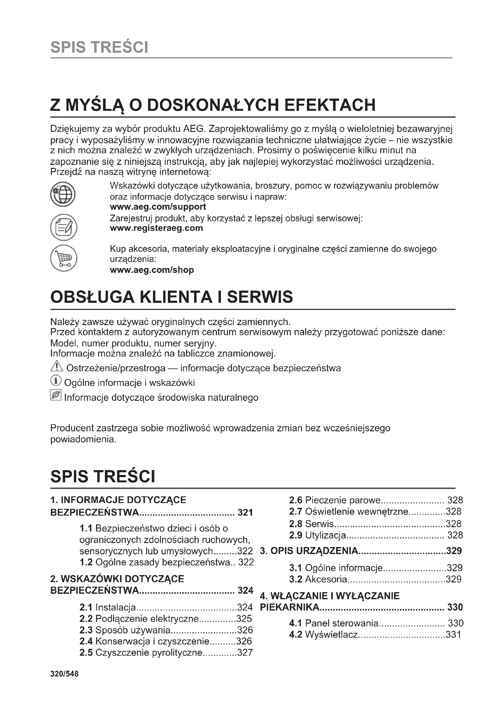 Atiduokite perdirbti medžiagas, pažymėtas šiuo ženklu . Išmeskite pakuotę į atitinkamą atliekų surinkimo konteinerį, kad ji būtų perdirbta. Padėkite saugoti aplinką bei žmonių sveikatą ir surinkti bei perdirbti elektros ir elektronikos prietaisų atliekas. Neišmeskite šiuo ženklu pažymėtų prietaisų kartu su kitomis buitinėmis atliekomis. Atiduokite šį gaminį į vietos atliekų surinkimo punktą arba susisiekite su vietos savivaldybe dėl papildomos informacijos. 319/548 PASINAUDOKITE NUORODA!Z MYŚLĄ O DOSKONAŁYCH EFEKTACH Dziękujemy za wybór produktu AEG. Zaprojektowaliśmy go z myślą o wieloletniej bezawaryjnej pracy i wyposażyliśmy w innowacyjne rozwiązania techniczne ułatwiające życie – nie wszystkie z nich można znaleźć w zwykłych urządzeniach. Prosimy o poświęcenie kilku minut na zapoznanie się z niniejszą instrukcją, aby jak najlepiej wykorzystać możliwości urządzenia. Przejdź na naszą witrynę internetową: Wskazówki dotyczące użytkowania, broszury, pomoc w rozwiązywaniu problemów oraz informacje dotyczące serwisu i napraw: www.aeg.com/support Zarejestruj produkt, aby korzystać z lepszej obsługi serwisowej: www.registeraeg.com Kup akcesoria, materiały eksploatacyjne i oryginalne części zamienne do swojego urządzenia: www.aeg.com/shop