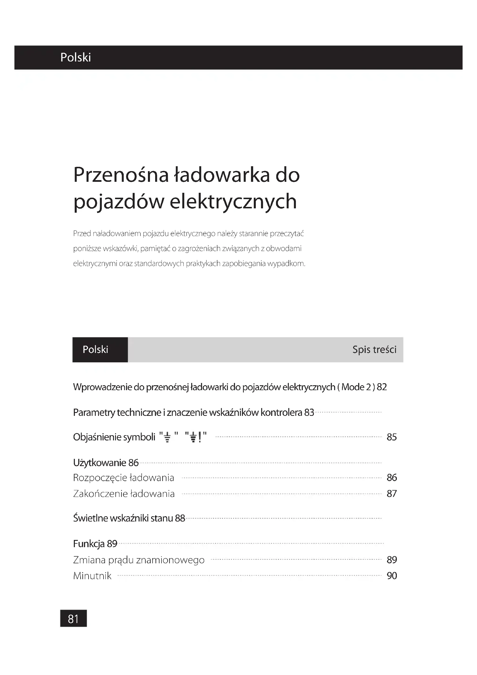 Minutnik Użytkowanie 86 Funkcja 89 Polski Polski Przenośna ładowarka do pojazdów elektrycznych Przed naładowaniem pojazdu elektrycznego należy starannie przeczytać poniższe wskazówki, pamiętać o zagrożeniach związanych z obwodami elektrycznymi oraz standardowych praktykach zapobiegania wypadkom. Spis treściWprowadzenie do przenośnej ładowarki do pojazdów elektrycznych ( Mode 2 ) UWAGA