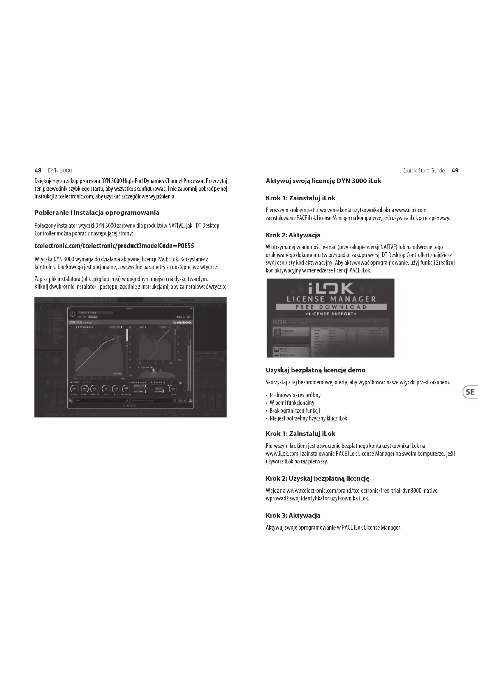 Music Tribe nie ponosi odpowiedzialności za jakiekolwiek straty, które mogą ponieść osoby, które polegają w całości lub w części na jakimkolwiek opisie, fotograi lub oświadczeniu zawartym w niniejszym dokumencie. Specykacje techniczne, wygląd i inne informacje mogą ulec zmianie bez powiadomienia. Wszystkie znaki towarowe są własnością ich odpowiednich właścicieli. Midas, Klark Teknik, Lab Gruppen, Lake, Tannoy, Turbosound, TC Electronic, TC Helicon, Behringer, Bugera, Aston Microphones i Coolaudio są znakami towarowymi lub zastrzeżonymi znakami towarowymi rmy Music Tribe Global Brands Ltd. © Music Tribe Global Brands Ltd. 2022 Wszystkie prawa zastrzeżone. OGRANICZONA GWARANCJA Aby zapoznać się z obowiązującymi warunkami gwarancji i dodatkowymi informacjami dotyczącymi ograniczonej gwarancji Music Tribe, zapoznaj się ze wszystkimi szczegółami w trybie online pod adresem community.musictribe.com/pages/ support#warranty. Ważne informacje o bezpieczeństwie20 DYN 3000 21Quick Start Guide Thank you for purchasing the DYN 3000 High-End Dynamics Channel Processor. Read through this Quick Start Guide to get things set up, and don’t forget to download the full manual from tcelectronic.com for all the in-depth explanations. Software Download and Installation The combined DYN 3000 plug-in installer for both the NATIVE and DT Desktop Controller products can be downloaded from the following page: tcelectronic.com/tcelectronic/product?modelCode=P0E55 The DYN 3000 plug-in requires an active PACE iLok license to work. Using the Desktop Controller is optional and all parameters are available in the plug-in. Save the installer le (.pkg or .msi le) in a convenient location on your hard drive. Double click the installer and follow the instructions to install the plug-in. Activate your DYN 3000 iLok license Step 1: Install iLok The rst step is to create an iLok user account at www.iLok.com and install the PACE iLok License Manager on your computer if it’s your rst time using iLok. Step 2: Activation In the received mail (when buying the NATIVE version) or on the backside of this printed document (when you have purchased the DT Desktop Controller version) you will nd your personal Activation Code. To activate your software, please use the Redeem an Activation Code feature in the PACE iLok License Manager. Get a Free Demo License Make use of this hassle-free oer to try out our plug-ins before you buy.