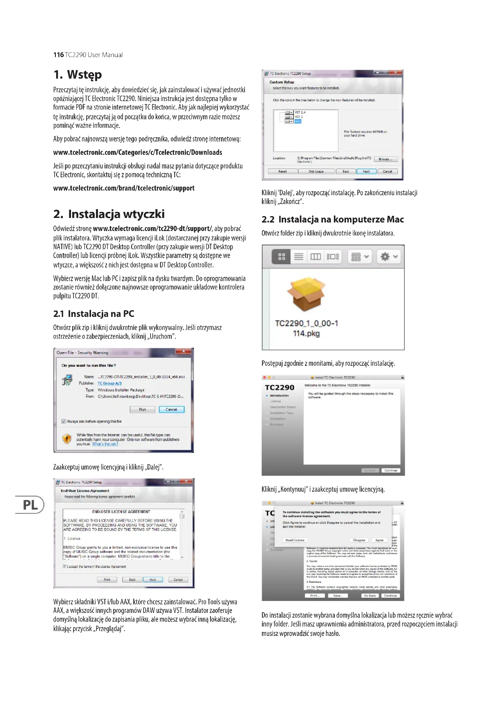 Odwiedź stronę www.tcelectronic.com/tc2290-dt/support/, aby pobrać plik instalatora. Wtyczka wymaga licencji iLok (dostarczanej przy zakupie wersji NATIVE) lub TC2290 DT Desktop Controller (przy zakupie wersji DT Desktop Controller) lub licencji próbnej iLok. Wszystkie parametry są dostępne we wtyczce, a większość z nich jest dostępna w DT Desktop Controller. Wybierz wersję Mac lub PC i zapisz plik na dysku twardym. Do oprogramowania zostanie również dołączone najnowsze oprogramowanie układowe kontrolera pulpitu TC2290 DT.
