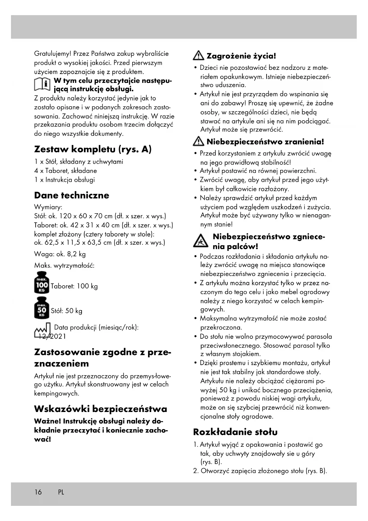 - Dzięki prostemu i szybkiemu montażu, artykuł nie jest tak stabilny jak standardowe stoły. Artykułu nie należy obciążać ciężarami po- wyżej 50 kg i unikać bocznego przeciążenia, ponieważ z powodu niskiej wagi artykułu, może on się szybciej przewrócić niż konwen- cjonalne stoły ogrodowe. Rozkładanie stołu