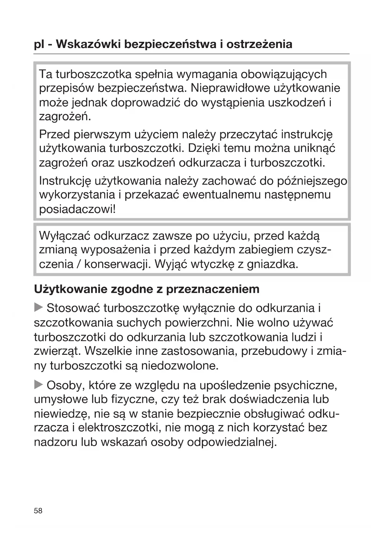 Ta turboszczotka spełnia wymagania obowiązujących przepisów bezpieczeństwa. Nieprawidłowe użytkowanie może jednak doprowadzić do wystąpienia uszkodzeń i zagrożeń. Przed pierwszym użyciem należy przeczytać instrukcję użytkowania turboszczotki. Dzięki temu można uniknąć zagrożeń oraz uszkodzeń odkurzacza i turboszczotki. Instrukcję użytkowania należy zachować do późniejszego wykorzystania i przekazać ewentualnemu następnemu posiadaczowi! Wyłączać odkurzacz zawsze po użyciu, przed każdą zmianą wyposażenia i przed każdym zabiegiem czysz- czenia / konserwacji. Wyjąć wtyczkę z gniazdka. Użytkowanie zgodne z przeznaczeniem Stosować turboszczotkę wyłącznie do odkurzania i szczotkowania suchych powierzchni. Nie wolno używać turboszczotki do odkurzania lub szczotkowania ludzi i zwierząt. Wszelkie inne zastosowania, przebudowy i zmia- ny turboszczotki są niedozwolone. Osoby, które ze względu na upośledzenie psychiczne, umysłowe lub fizyczne, czy też brak doświadczenia lub niewiedzę, nie są w stanie bezpiecznie obsługiwać odku- rzacza i elektroszczotki, nie mogą z nich korzystać bez nadzoru lub wskazań osoby odpowiedzialnej.pl - Wskazówki bezpieczeństwa i ostrzeżenia