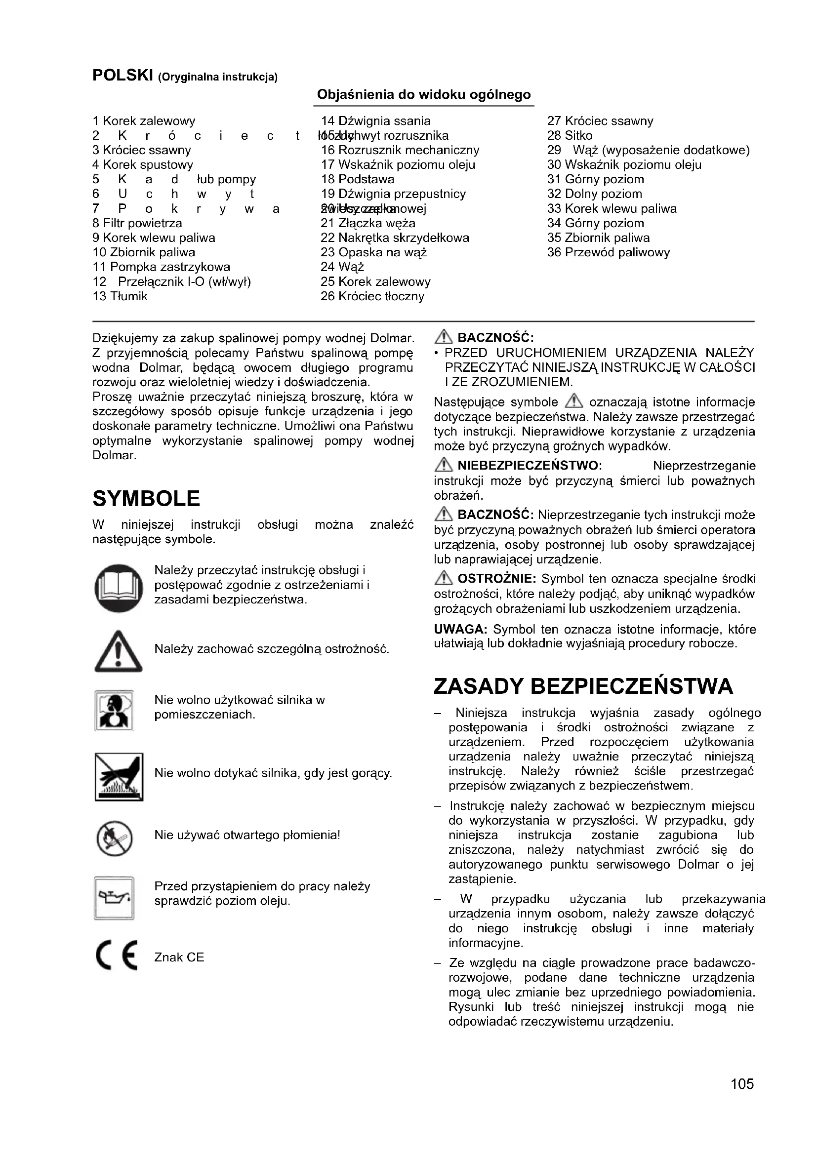 – Niniejsza instrukcja wyjaśnia zasady ogólnego postępowania i środki ostrożności związane z urządzeniem. Przed rozpoczęciem użytkowania urządzenia należy uważnie przeczytać niniejszą instrukcję. Należy również ściśle przestrzegać przepisów związanych z bezpieczeństwem. – Instrukcję należy zachować w bezpiecznym miejscu do wykorzystania w przyszłości. W przypadku, gdy niniejsza instrukcja zostanie zagubiona lub zniszczona, należy natychmiast zwrócić się do autoryzowanego punktu serwisowego Dolmar o jej zastąpienie. – W przypadku użyczania lub przekazywania urządzenia innym osobom, należy zawsze dołączyć do niego instrukcję obsługi i inne materiały informacyjne. – Ze względu na ciągle prowadzone prace badawczo- rozwojowe, podane dane techniczne urządzenia mogą ulec zmianie bez uprzedniego powiadomienia. Rysunki lub treść niniejszej instrukcji mogą nie odpowiadać rzeczywistemu urządzeniu. Należy przeczytać instrukcję obsługi i postępować zgodnie z ostrzeżeniami i zasadami bezpieczeństwa. Należy zachować szczególną ostrożność. Nie wolno użytkować silnika w pomieszczeniach. Nie wolno dotykać silnika, gdy jest gorący. Nie używać otwartego płomienia! Przed przystąpieniem do pracy należy sprawdzić poziom oleju. Znak CE106 – Aby uzyskać więcej informacji, należy zwrócić się do lokalnego przedstawiciela lub autoryzowanego punktu serwisowego Dolmar. Przeznaczenie urządzenia Urządzenie to służy wyłącznie do podlewania i nawadniania. Urządzenie jest przeznaczone tylko do pompowania czystej wody. NIEBEZPIECZEŃSTWO: