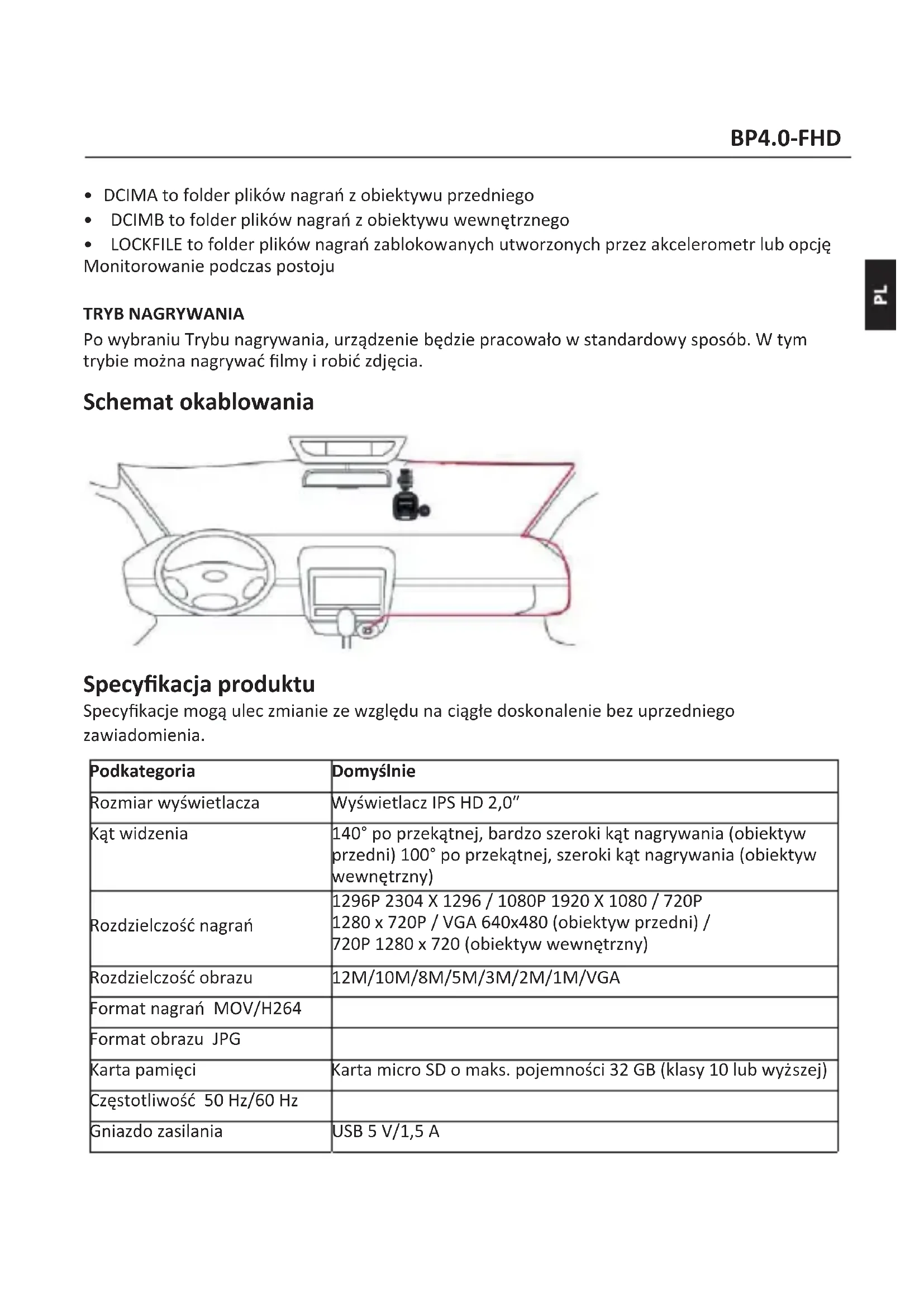 - LOCKFILE to folder plików nagrań zablokowanych utworzonych przez akcelerometr lub opcję Monitorowanie podczas postoju TRYB NAGRYWANIA Po wybraniu Trybu nagrywania, urządzenie będzie pracowało w standardowy sposób. W tym trybie można nagrywać filmy i robić zdjęcia. Schemat okablowania Specyfikacja produktu Specyfikacje mogą ulec zmianie ze względu na ciągłe doskonalenie bez uprzedniego zawiadomienia. Podkategoria Domyślnie Rozmiar wyświetlacza Wyświetlacz IPS HD 2,0ʺ Kąt widzenia 140° po przekątnej, bardzo szeroki kąt nagrywania (obiektyw przedni) 100° po przekątnej, szeroki kąt nagrywania (obiektyw wewnętrzny) Rozdzielczość nagrań 1296P 2304 X 1296 / 1080P 1920 X 1080 / 720P 1280 x 720P / VGA 640x480 (obiektyw przedni) / 720P 1280 x 720 (obiektyw wewnętrzny) Rozdzielczość obrazu 12M/10M/8M/5M/3M/2M/1M/VGA Format nagrań MOV/H264 Format obrazu JPG Karta pamięci Karta micro SD o maks. pojemności 32 GB (klasy 10 lub wyższej)