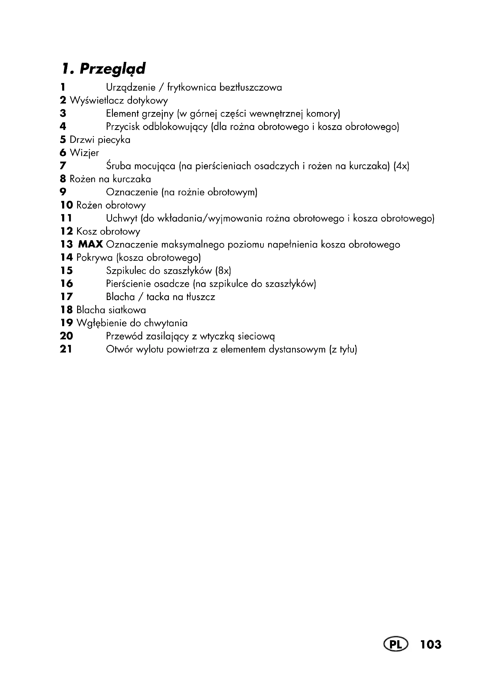 1 Urządzenie / frytkownica beztłuszczowa 2 Wyświetlacz dotykowy 3 Element grzejny (w górnej części wewnętrznej komory) 4 Przycisk odblokowujący (dla rożna obrotowego i kosza obrotowego) 5 Drzwi piecyka 6 Wizjer 7 Śruba mocująca (na pierścieniach osadczych i rożen na kurczaka) (4x) 8 Rożen na kurczaka 9 Oznaczenie (na rożnie obrotowym) 10 Rożen obrotowy 11 Uchwyt (do wkładania/wyjmowania rożna obrotowego i kosza obrotowego) 12 Kosz obrotowy 13 MAX Oznaczenie maksymalnego poziomu napełnienia kosza obrotowego 14 Pokrywa (kosza obrotowego) 15 Szpikulec do szaszłyków (8x) 16 Pierścienie osadcze (na szpikulce do szaszłyków) 17 Blacha / tacka na tłuszcz 18 Blacha siatkowa 19 Wgłębienie do chwytania 20 Przewód zasilający z wtyczką sieciową 21 Otwór wylotu powietrza z elementem dystansowym (z tyłu) __351606_2007_B8.book Seite 103 Dienstag, 8. Dezember 2020 2:41 14104