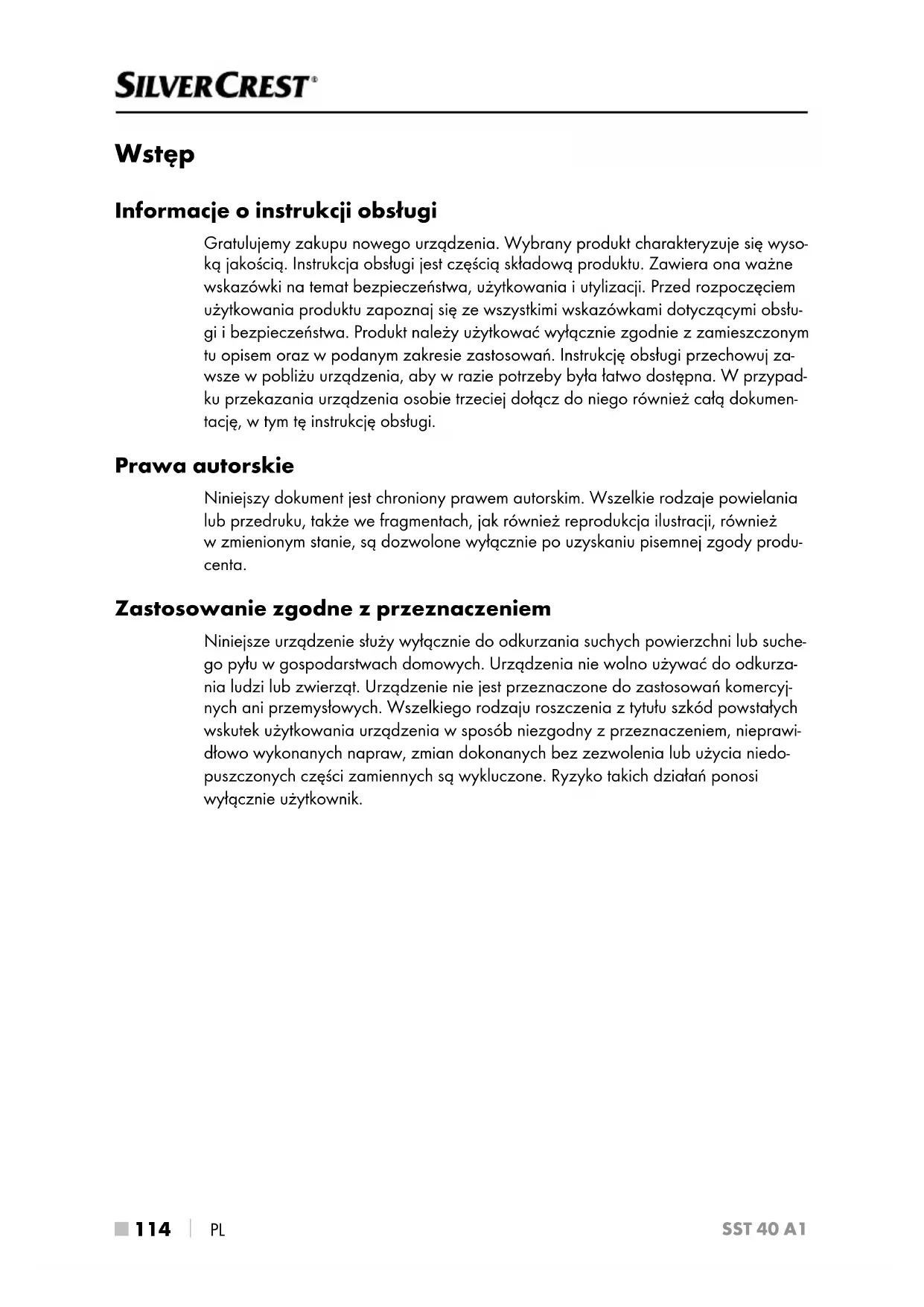PL SST 40 A1 Wstęp Informacje oinstrukcji obsługi Gratulujemy zakupu nowego urządzenia. Wybrany produkt charakteryzuje się wyso- ką jakością. Instrukcja obsługi jest częścią składową produktu. Zawiera ona ważne wskazówki na temat bezpieczeństwa, użytkowania iutylizacji. Przed rozpoczęciem użytkowania produktu zapoznaj się ze wszystkimi wskazówkami dotyczącymi obsłu- gi ibezpieczeństwa. Produkt należy użytkować wyłącznie zgodnie zzamieszczonym tu opisem oraz wpodanym zakresie zastosowań. Instrukcję obsługi przechowuj za- wsze wpobliżu urządzenia, aby wrazie potrzeby była łatwo dostępna. Wprzypad- ku przekazania urządzenia osobie trzeciej dołącz do niego również całą dokumen- tację, wtym tę instrukcję obsługi. Prawa autorskie Niniejszy dokument jest chroniony prawem autorskim. Wszelkie rodzaje powielania lub przedruku, także we fragmentach, jak również reprodukcja ilustracji, również wzmienionym stanie, są dozwolone wyłącznie po uzyskaniu pisemnej zgody produ- centa. Zastosowanie zgodne zprzeznaczeniem Niniejsze urządzenie służy wyłącznie do odkurzania suchych powierzchni lub suche- go pyłu w gospodarstwach domowych. Urządzenia nie wolno używać do odkurza- nia ludzi lub zwierząt. Urządzenie nie jest przeznaczone do zastosowań komercyj- nych ani przemysłowych. Wszelkiego rodzaju roszczenia ztytułu szkód powstałych wskutek użytkowania urządzenia wsposób niezgodny zprzeznaczeniem, nieprawi- dłowo wykonanych napraw, zmian dokonanych bez zezwolenia lub użycia niedo- puszczonych części zamiennych są wykluczone. Ryzyko takich działań ponosi wyłącznie użytkownik. IB_329834_SST40A1_LB8.indb 114 24.09.2021 08:41:49PL