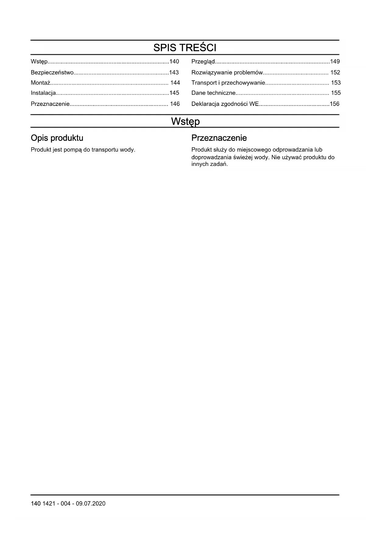 - Deklaracja zgodności WE Wstęp Opis produktu Produkt jest pompą do transportu wody. Przeznaczenie Produkt służy do miejscowego odprowadzania lub doprowadzania świeżej wody. Nie używać produktu do innych zadań. 140 1421 - 004 - 09.07.2020Przegląd produktu p. 156