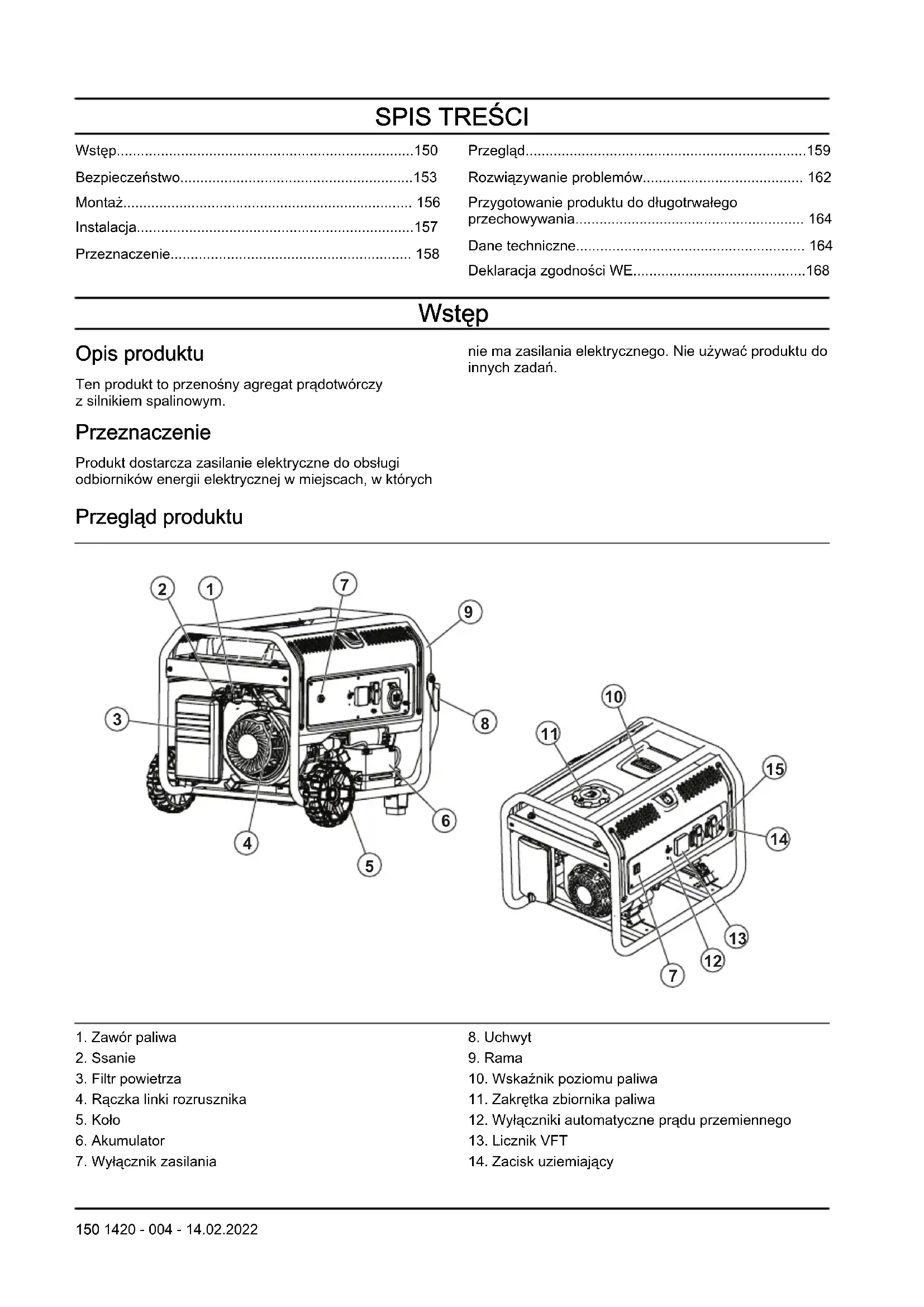 - Deklaracja zgodności WE Wstęp Opis produktu Ten produkt to przenośny agregat prądotwórczy z silnikiem spalinowym. Przeznaczenie Produkt dostarcza zasilanie elektryczne do obsługi odbiorników energii elektrycznej w miejscach, w których nie ma zasilania elektrycznego. Nie używać produktu do innych zadań. Przegląd produktu p. 168