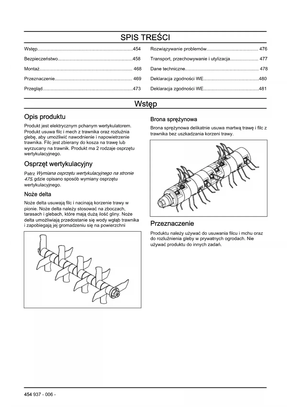 - Deklaracja zgodności WE Wstęp Opis produktu Produkt jest elektrycznym pchanym wertykulatorem. Produkt usuwa filc i mech z trawnika oraz rozluźnia glebę, aby umożliwić nawodnienie i napowietrzenie trawnika. Filc jest zbierany do kosza na trawę lub wyrzucany na trawnik. Produkt ma 2 rodzaje osprzętu wertykulacyjnego. Osprzęt wertykulacyjny Patrz Wymiana osprzętu wertykulacyjnego na stronie p. 481