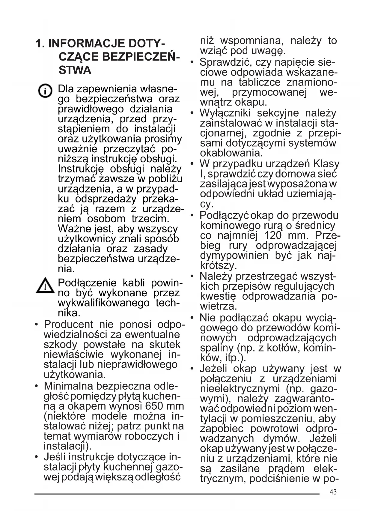 - Minimalna bezpieczna odle- głość pomiędzy płytą kuchen- ną a okapem wynosi 650 mm (niektóre modele można in- stalować niżej; patrz punkt na temat wymiarów roboczych i instalacji).