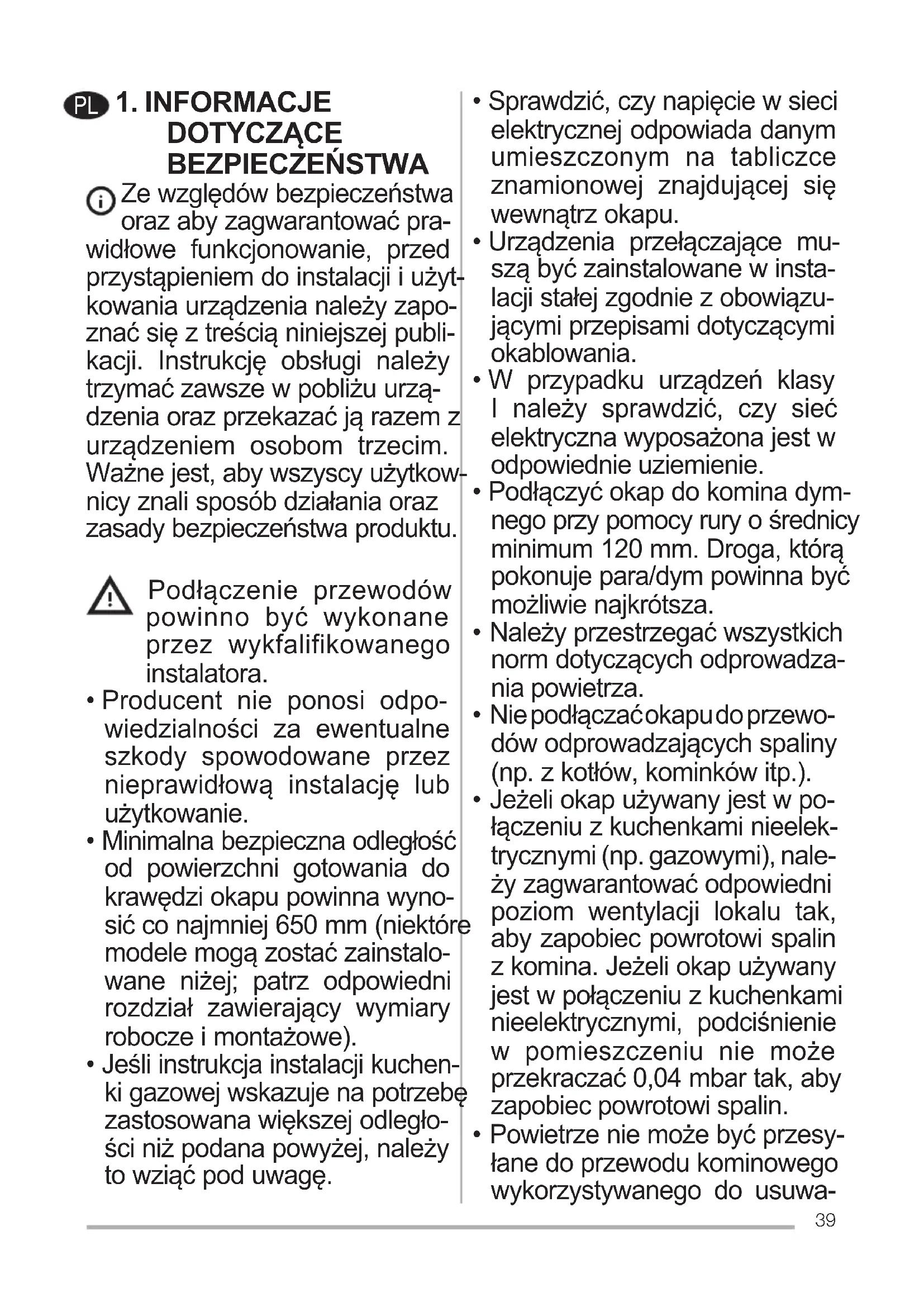 DOTYCZĄCE BEZPIECZEŃSTWA Ze względów bezpieczeństwa oraz aby zagwarantować pra- widłowe funkcjonowanie, przed przystąpieniem do instalacji i użyt- kowania urządzenia należy zapo- znać się z treścią niniejszej publi- kacji. Instrukcję obsługi należy trzymać zawsze w pobliżu urzą- dzenia oraz przekazać ją razem z urządzeniem osobom trzecim. Ważne jest, aby wszyscy użytkow- nicy znali sposób działania oraz zasady bezpieczeństwa produktu. Podłączenie przewodów powinno być wykonane przez wykfalifikowanego instalatora.