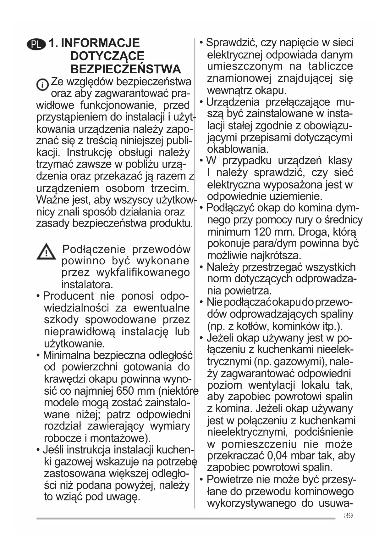 DOTYCZĄCE BEZPIECZEŃSTWA Ze względów bezpieczeństwa oraz aby zagwarantować pra- widłowe funkcjonowanie, przed przystąpieniem do instalacji i użyt- kowania urządzenia należy zapo- znać się z treścią niniejszej publi- kacji. Instrukcję obsługi należy trzymać zawsze w pobliżu urzą- dzenia oraz przekazać ją razem z urządzeniem osobom trzecim. Ważne jest, aby wszyscy użytkow- nicy znali sposób działania oraz zasady bezpieczeństwa produktu. Podłączenie przewodów powinno być wykonane przez wykfalifikowanego instalatora.