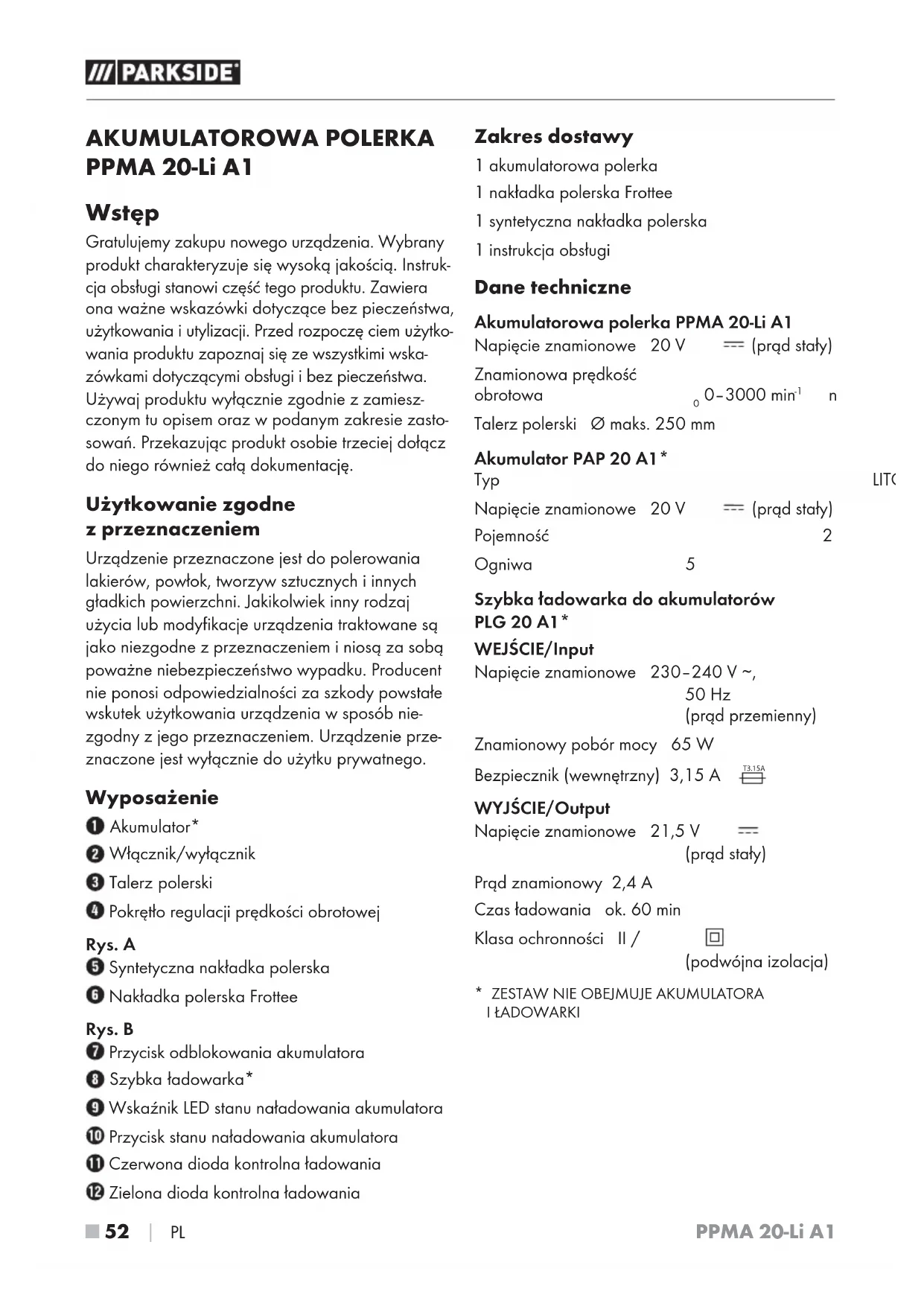 PL AKUMULATOROWA POLERKA PPMA 20-Li A1 Wstęp Gratulujemy zakupu nowego urządzenia. Wybrany produkt charakteryzuje się wysoką jakością. Instruk- cja obsługi stanowi część tego produktu. Zawiera ona ważne wskazówki dotyczące bez pieczeństwa, użytkowania iutylizacji. Przed rozpoczę ciem użytko- wania produktu zapoznaj się ze wszystkimi wska- zówkami dotyczącymi obsługi ibez pieczeństwa. Używaj produktu wyłącznie zgodnie zzamiesz- czonym tu opisem oraz wpodanym zakresie zasto- sowań. Przekazując produkt osobie trzeciej dołącz do niego również całą dokumentację. Użytkowanie zgodne z przeznaczeniem Urządzenie przeznaczone jest do polerowania lakierów, powłok, tworzyw sztucznych i innych gładkich powierzchni. Jakikolwiek inny rodzaj użycia lub modyfikacje urządzenia traktowane są jako niezgodne z przeznaczeniem i niosą za sobą poważne niebezpieczeństwo wypadku. Producent nie ponosi odpowiedzialności za szkody powstałe wskutek użytkowania urządzenia wsposób nie- zgodny zjego przeznaczeniem. Urządzenie prze- znaczone jest wyłącznie do użytku prywatnego. Wyposażenie Akumulator* Włącznik/wyłącznik Talerz polerski Pokrętło regulacji prędkości obrotowej Rys. A Syntetyczna nakładka polerska Nakładka polerska Frottee Rys. B Przycisk odblokowania akumulatora Szybka ładowarka* Wskaźnik LED stanu naładowania akumulatora Przycisk stanu naładowania akumulatora Czerwona dioda kontrolna ładowania Zielona dioda kontrolna ładowania Zakres dostawy 1 akumulatorowa polerka 1 nakładka polerska Frottee 1 syntetyczna nakładka polerska 1 instrukcja obsługi Dane techniczne Akumulatorowa polerka PPMA 20-Li A1 Napięcie znamionowe 20 V (prąd stały) Znamionowa prędkość obrotowa n