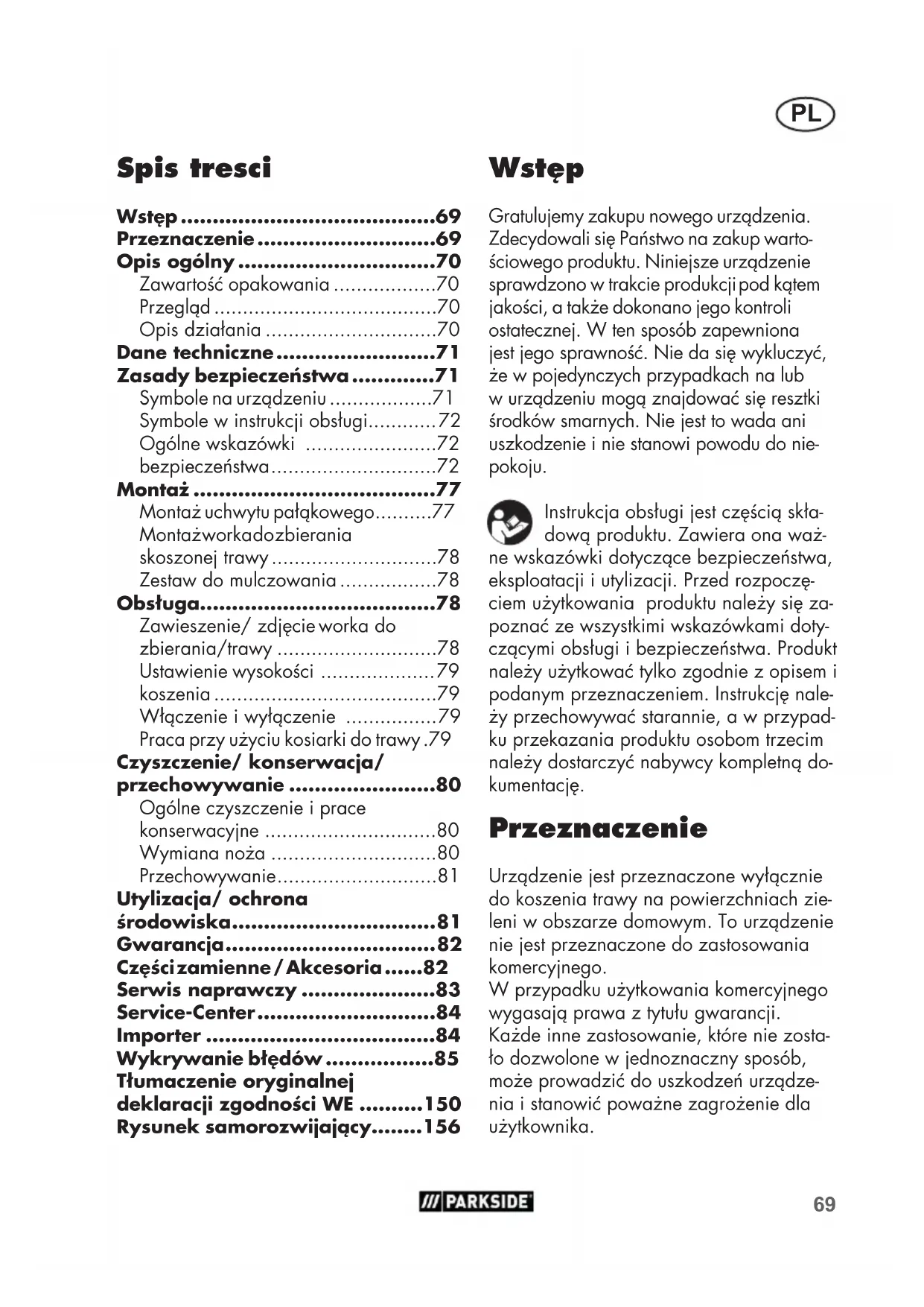 - Wstęp Gratulujemy zakupu nowego urządzenia. Zdecydowali się Państwo na zakup warto- ściowego produktu. Niniejsze urządzenie sprawdzono w trakcie produkcji pod kątem jakości, a także dokonano jego kontroli ostatecznej. W ten sposób zapewniona jest jego sprawność. Nie da się wykluczyć, że w pojedynczych przypadkach na lub w urządzeniu mogą znajdować się resztki środków smarnych. Nie jest to wada ani uszkodzenie i nie stanowi powodu do nie- pokoju. Instrukcja obsługi jest częścią skła- dową produktu. Zawiera ona waż- ne wskazówki dotyczące bezpieczeństwa, eksploatacji i utylizacji. Przed rozpoczę- ciem użytkowania produktu należy się za- poznać ze wszystkimi wskazówkami doty- czącymi obsługi i bezpieczeństwa. Produkt należy użytkować tylko zgodnie z opisem i podanym przeznaczeniem. Instrukcję nale- ży przechowywać starannie, a w przypad- ku przekazania produktu osobom trzecim należy dostarczyć nabywcy kompletną do- kumentację. Przeznaczenie Urządzenie jest przeznaczone wyłącznie do koszenia trawy na powierzchniach zie- leni w obszarze domowym. To urządzenie nie jest przeznaczone do zastosowania komercyjnego. W przypadku użytkowania komercyjnego wygasają prawa z tytułu gwarancji. Każde inne zastosowanie, które nie zosta- ło dozwolone w jednoznaczny sposób, może prowadzić do uszkodzeń urządze- nia i stanowić poważne zagrożenie dla użytkownika. Tłumaczenie oryginalnej deklaracji zgodności WE p. 150