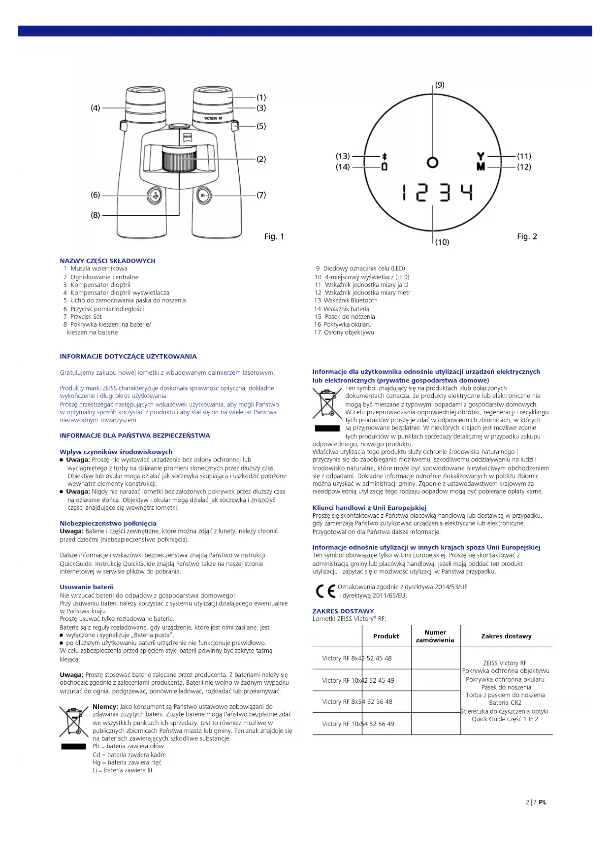1 Muszla wziernikowa 2 Ogniskowanie centralne 3 Kompensator dioptrii 4 Kompensator dioptrii wyświetlacza 5 Ucho do zamocowania paska do noszenia 6 Przycisk pomiar odległości 7 Przycisk Set 8 Pokrywka kieszeni na baterie/ kieszeń na baterie Informacje dla użytkownika odnośnie utylizacji urządzeń elektrycznych lub elektronicznych (prywatne gospodarstwa domowe) Ten symbol znajdujący się na produktach i/lub dołączonych dokumentach oznacza, że produkty elektryczne lub elektroniczne nie mogą być mieszane z typowymi odpadami z gospodarstw domowych. W celu przeprowadzania odpowiedniej obróbki, regeneracji i recyklingu tych produktów proszę je zdać w odpowiednich zbiornicach, w których są przyjmowane bezpłatnie. W niektórych krajach jest możliwe zdanie tych produktów w punktach sprzedaży detalicznej w przypadku zakupu odpowiedniego, nowego produktu. Właściwa utylizacja tego produktu służy ochronie środowiska naturalnego i przyczynia się do zapobiegania możliwemu, szkodliwemu oddziaływaniu na ludzi i środowisko naturalne, które może być spowodowane niewłaściwym obchodzeniem się z odpadami. Dokładne informacje odnośnie zlokalizowanych w pobliżu zbiornic można uzyskać w administracji gminy. Zgodnie z ustawodawstwem krajowym za nieodpowiednią utylizację tego rodzaju odpadów mogą być pobierane opłaty karne. Klienci handlowi z Unii Europejskiej Proszę się skontaktować z Państwa placówką handlową lub dostawcą w przypadku, gdy zamierzają Państwo zutylizować urządzenia elektryczne lub elektroniczne. Przygotował on dla Państwa dalsze informacje. Informacje odnośnie utylizacji w innych krajach spoza Unii Europejskiej Ten symbol obowiązuje tylko w Unii Europejskiej. Proszę się skontaktować z administracją gminy lub placówką handlową, jeżeli mają poddać ten produkt utylizacji, i zapytać się o możliwość utylizacji w Państwa przypadku. Oznakowania zgodnie z dyrektywą 2014/53/UE i dyrektywą 2011/65/EU. ZAKRES DOSTAWY Lornetki ZEISS Victory
