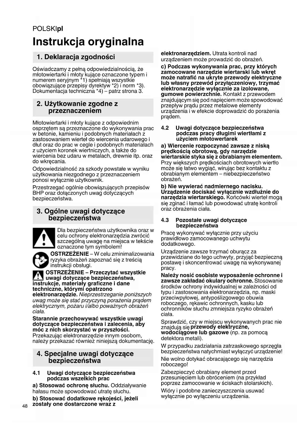 Oświadczamy z pełną odpowiedzialnością, że młotowiertarki i młoty kujące oznaczone typem i numerem seryjnym *1) spełniają wszystkie obowiązujące przepisy dyrektyw *2) i norm *3). Dokumentacja techniczna *4) – patrz strona 3. Młotowiertarki i młoty kujące z odpowiednim osprzętem są przeznaczone do wykonywania prac w betonie, kamieniu i podobnych materiałach z zastosowaniem wierteł do wiercenia udarowego i dłut oraz do prac w cegle i podobnych materiałach z użyciem koronek wiertniczych, a także do wiercenia bez udaru w metalach, drewnie itp. oraz do wkręcania. Odpowiedzialność za szkody powstałe w wyniku użytkowania niezgodnego z przeznaczeniem ponosi wyłącznie użytkownik. Przestrzegać ogólnie obowiązujących przepisów BHP oraz dołączonych uwag dotyczących bezpieczeństwa. Dla bezpieczeństwa użytkownika oraz w celu ochrony elektronarzędzia zwrócić szczególną uwagę na miejsca w tekście oznaczone tym symbolem! OSTRZEŻENIE – W celu zminimalizowania ryzyka obrażeń zapoznać się z treścią instrukcji obsługi. OSTRZEŻENIE – Przeczytać wszystkie uwagi dotyczące bezpieczeństwa, instrukcje, materiały graficzne i dane techniczne, którymi opatrzono elektronarzędzie. Nieprzestrzeganie poniższych uwag może się stać przyczyną porażenia prądem elektrycznym, pożaru i/albo poważnych obrażeń ciała. Starannie przechowywać wszystkie uwagi dotyczące bezpieczeństwa i zalecenia, aby móc z nich skorzystać w przyszłości. Przekazując elektronarzędzie innym osobom, należy przekazać również niniejszą dokumentację.