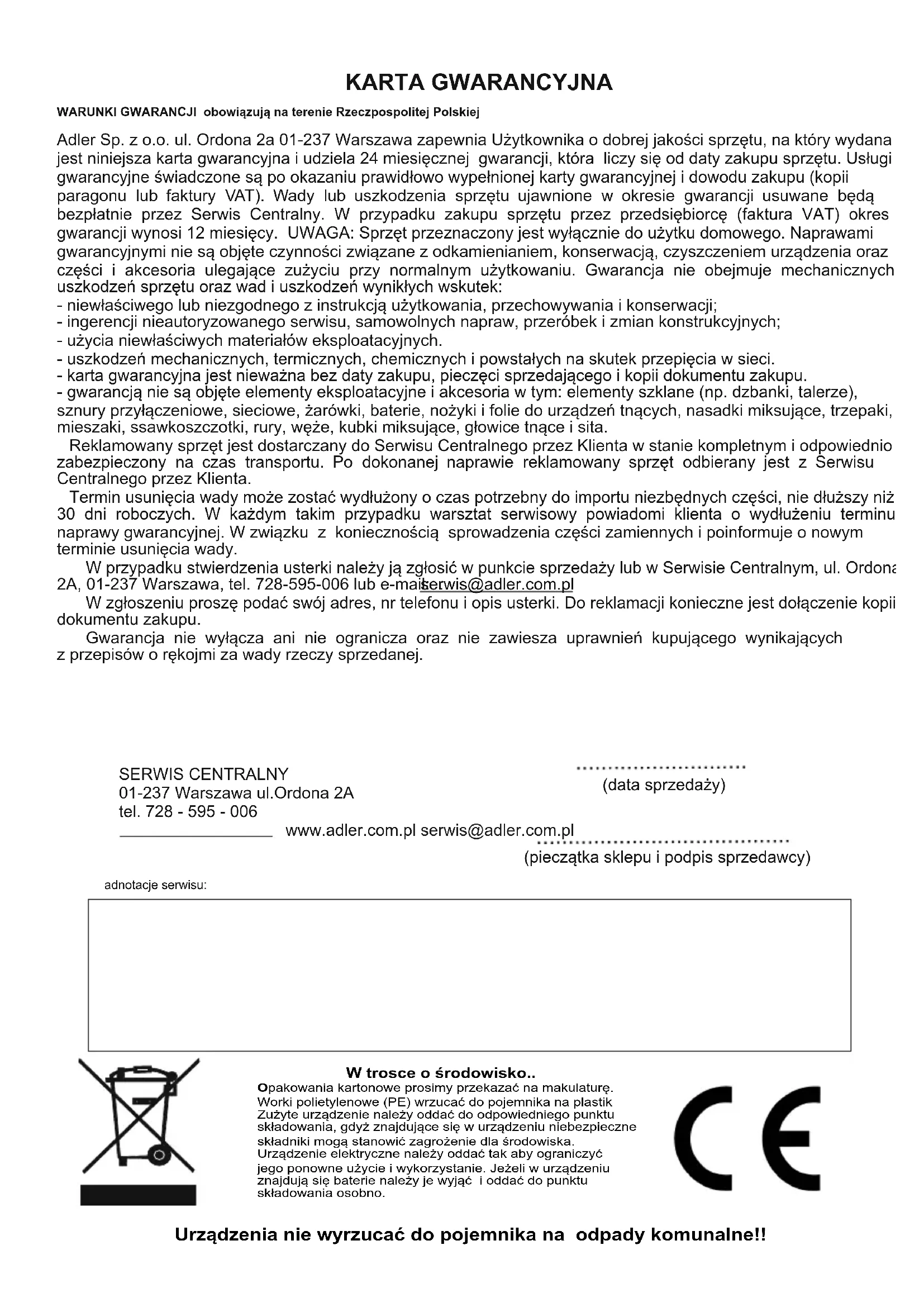TEKNISKA DATA Nominal effekt: 1000W Maximal effekt: 1300W Energiförsörjning: 220-240V~50/60Hz 44KARTA GWARANCYJNA WARUNKI GWARANCJI obowiązują na terenie Rzeczpospolitej Polskiej Adler Sp. z o.o. ul. Ordona 2a 01-237 Warszawa zapewnia Użytkownika o dobrej jakości sprzętu, na który wydana jest niniejsza karta gwarancyjna i udziela 24 miesięcznej gwarancji, która liczy się od daty zakupu sprzętu. Usługi gwarancyjne świadczone są po okazaniu prawidłowo wypełnionej karty gwarancyjnej i dowodu zakupu (kopii paragonu lub faktury VAT). Wady lub uszkodzenia sprzętu ujawnione w okresie gwarancji usuwane będą bezpłatnie przez Serwis Centralny. W przypadku zakupu sprzętu przez przedsiębiorcę (faktura VAT) okres gwarancji wynosi 12 miesięcy. UWAGA: Sprzęt przeznaczony jest wyłącznie do użytku domowego. Naprawami gwarancyjnymi nie są objęte czynności związane z odkamienianiem, konserwacją, czyszczeniem urządzenia oraz części i akcesoria ulegające zużyciu przy normalnym użytkowaniu. Gwarancja nie obejmuje mechanicznych uszkodzeń sprzętu oraz wad i uszkodzeń wynikłych wskutek: - niewłaściwego lub niezgodnego z instrukcją użytkowania, przechowywania i konserwacji; - ingerencji nieautoryzowanego serwisu, samowolnych napraw, przeróbek i zmian konstrukcyjnych; - użycia niewłaściwych materiałów eksploatacyjnych. - uszkodzeń mechanicznych, termicznych, chemicznych i powstałych na skutek przepięcia w sieci. - karta gwarancyjna jest nieważna bez daty zakupu, pieczęci sprzedającego i kopii dokumentu zakupu. - gwarancją nie są objęte elementy eksploatacyjne i akcesoria w tym: elementy szklane (np. dzbanki, talerze), sznury przyłączeniowe, sieciowe, żarówki, baterie, nożyki i folie do urządzeń tnących, nasadki miksujące, trzepaki, mieszaki, ssawkoszczotki, rury, węże, kubki miksujące, głowice tnące i sita. Reklamowany sprzęt jest dostarczany do Serwisu Centralnego przez Klienta w stanie kompletnym i odpowiednio zabezpieczony na czas transportu. Po dokonanej naprawie reklamowany sprzęt odbierany jest z Serwisu Centralnego przez Klienta. Termin usunięcia wady może zostać wydłużony o czas potrzebny do importu niezbędnych części, nie dłuższy niż 30 dni roboczych. W każdym takim przypadku warsztat serwisowy powiadomi klienta o wydłużeniu terminu naprawy gwarancyjnej. W związku z koniecznością sprowadzenia części zamiennych i poinformuje o nowym terminie usunięcia wady. W przypadku stwierdzenia usterki należy ją zgłosić w punkcie sprzedaży lub w Serwisie Centralnym, ul. Ordona 2A, 01-237 Warszawa, tel. 728-595-006 lub e-mail: . W zgłoszeniu proszę podać swój adres, nr telefonu i opis usterki. Do reklamacji konieczne jest dołączenie kopii dokumentu zakupu. Gwarancja nie wyłącza ani nie ogranicza oraz nie zawiesza uprawnień kupującego wynikających z przepisów o rękojmi za wady rzeczy sprzedanej. serwis@adler.com.pl SERWIS CENTRALNY 01-237 Warszawa ul.Ordona 2A tel. 728 - 595 - 006 www.adler.com.pl serwis@adler.com.pl (data sprzedaży) (pieczątka sklepu i podpis sprzedawcy) adnotacje serwisu: Urządzenia nie wyrzucać do pojemnika na odpady komunalne!!