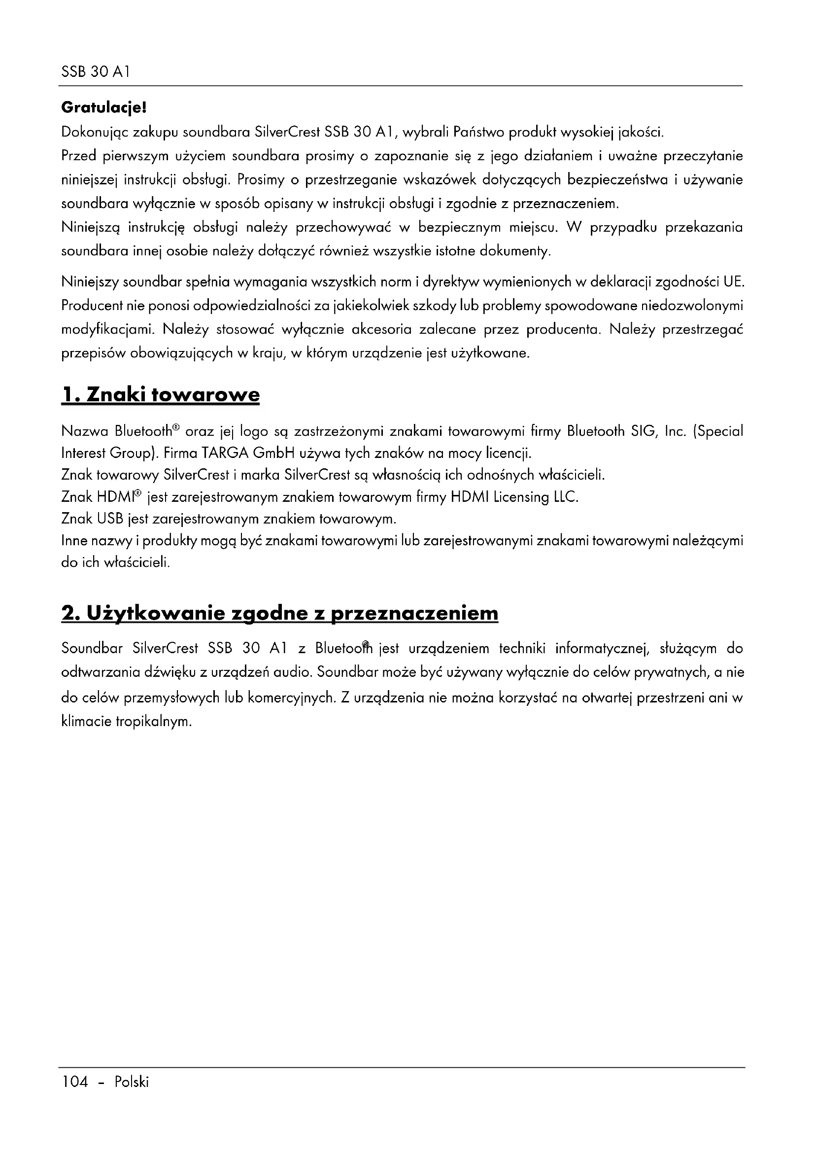 104 – Polski Gratulacje! Dokonując zakupu soundbara SilverCrest SSB 30 A1, wybrali Państwo produkt wysokiej jakości. Przed pierwszym użyciem soundbara prosimy o zapoznanie się z jego działaniem i uważne przeczytanie niniejszej instrukcji obsługi. Prosimy o przestrzeganie wskazówek dotyczących bezpieczeństwa i używanie soundbara wyłącznie w sposób opisany w instrukcji obsługi i zgodnie z przeznaczeniem. Niniejszą instrukcję obsługi należy przechowywać w bezpiecznym miejscu. W przypadku przekazania soundbara innej osobie należy dołączyć również wszystkie istotne dokumenty. Niniejszy soundbar spełnia wymagania wszystkich norm i dyrektyw wymienionych w deklaracji zgodności UE. Producent nie ponosi odpowiedzialności za jakiekolwiek szkody lub problemy spowodowane niedozwolonymi modyfikacjami. Należy stosować wyłącznie akcesoria zalecane przez producenta. Należy przestrzegać przepisów obowiązujących w kraju, w którym urządzenie jest użytkowane.