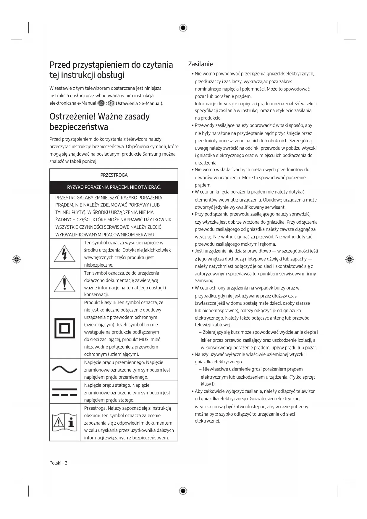 - Rysunki i ilustracje w niniejszej instrukcji obsługi służą wyłącznie jako przykład i mogą odbiegać od faktycznego wyglądu urządzenia. Wygląd produktu i jego dane techniczne mogą ulec zmianie bez uprzedzenia. Firma Samsung nie ponosi odpowiedzialności za jakiekolwiek zniszczenie, uszkodzenie lub problemy związane z bezpieczeństwem produktu spowodowane próbą naprawy przez nieautoryzowane punkty serwisowe oraz samodzielną lub nieprofesjonalną naprawą, podczas której nie były przestrzegane instrukcje naprawy oraz konserwacji. Wszelkie uszkodzenia spowodowane próbą naprawy przez osoby inne niż autoryzowani partnerzy Samsung, nie będą objęte gwarancją. Odwiedź stronę samsung.com/support, żeby sprawdzić dodatkowe informacje dotyczące zewnętrznego zasilacza oraz zdalnej kontroli zgodnie z europejską dyrektywą Ecodesign (Ekoprojekt)- dyrektywa ErP Polski - 8Prawidłowa utylizacja tego produktu (przepisy dotyczące zużytego sprzętu elektrycznego i elektronicznego) (Dotyczy krajów korzystających z oddzielnych systemów segregacji odpadów). Oznaczenie umieszczone na produkcie, akcesoriach lub w instrukcji wskazuje, że produktu i jego elektronicznych akcesoriów (np. ładowarki, zestawu słuchawkowego, kabla USB itd.) po upływie okresu użytkowania nie należy usuwać wraz z innymi odpadami pochodzącymi z gospodarstw domowych. W celu uniknięcia skażenia środowiska lub narażenia na utratę zdrowia z powodu nieprawidłowej utylizacji, należy oddzielić te odpady od innych i pozbyć się ich w sposób odpowiedzialny i umożliwiający ponowne wykorzystanie surowców. Użytkownicy domowi powinni skontaktować się ze sprzedawcą, u którego zakupili produkt, lub z organizacjami samorządowymi w celu uzyskania informacji na temat miejsca i sposobu bezpiecznej utylizacji tych produktów. Użytkownicy instytucjonalni powinni skontaktować się ze swoim dostawcą i sprawdzić warunki umowy zakupu. Produktu nie należy usuwać wraz z innymi odpadami komercyjnymi. Prawidłowa utylizacja baterii używanych wraz z produktem (Dotyczy krajów korzystających z oddzielnych systemów segregacji odpadów). Takie oznaczenie umieszczone na baterii, w instrukcji lub na opakowaniu wskazuje, że po upływie okresu użytkowania baterii nie należy usuwać wraz z innymi odpadami pochodzącymi z gospodarstw domowych. Chemiczne symbole Hg, Cd lub Pb wskazują, że bateria zawiera rtęć, kadm lub ołów w ilościach przekraczających poziom ustalony w dyrektywie 2006/66/WE. Wprzypadku nieprawidłowej utylizacji baterii substancje te mogą stanowić zagrożenie dla zdrowia człowieka lub dla środowiska. Aby chronić zasoby naturalne oraz promować ponowne wykorzystywanie materiałów, należy oddzielić baterie od innych odpadów i utylizować je, korzystając z lokalnego, bezpłatnego systemu zwrotu baterii. Polski - 9 PolskiAntes de ler o manual do utilizador Este televisor vem acompanhado deste manual do utilizador e de e-Manual incluído ( > Definições > e-Manual). Aviso! Instruções de segurança importantes Leia as instruções de segurança antes de usar o televisor. Consulte a tabela abaixo para uma explicação sobre os símbolos que podem estar presentes no seu produto Samsung. CUIDADO RISCO DE CHOQUE ELÉCTRICO. NÃO ABRIR. CUIDADO: PARA REDUZIR O RISCO DE CHOQUE ELÉCTRICO, NÃO RETIRE A TAMPA (NEM O PAINEL POSTERIOR). NÃO CONTÉM PEÇAS QUE POSSAM SER REPARADAS OU SUBSTITUÍDAS PELO UTILIZADOR. SOLICITE ASSISTÊNCIA JUNTO DO PESSOAL DE ASSISTÊNCIA QUALIFICADO. Este símbolo indica a presença de alta tensão no interior do produto. É perigoso estabelecer qualquer tipo de contacto com as peças existentes no interior do produto. Este símbolo indica a existência de documentação importante relativa ao funcionamento e manutenção deste produto (fornecida com o mesmo). Produto de classe II: este símbolo indica que não é necessária uma ligação eléctrica à terra de segurança. Se este símbolo não estiver presente num produto com cabo de alimentação, o produto TEM de ter uma ligação fiável à terra. Tensão CA: a tensão nominal indicada por este símbolo corresponde à tensão CA. Tensão CC: a tensão nominal indicada por este símbolo corresponde à tensão CC. Atenção. Consulte as instruções de utilização: este símbolo aconselha o utilizador a consultar o manual do utilizador quanto a informações de segurança. Potência