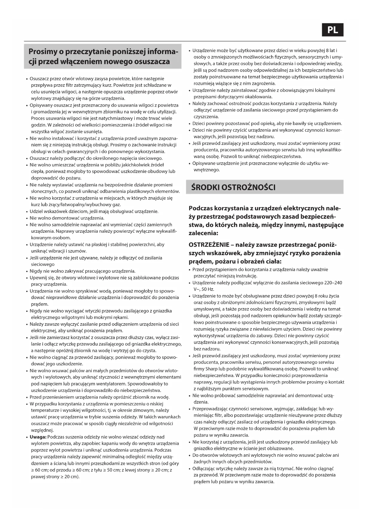 UDP20EW - Osuszacz SHARP - Bezpłatna instrukcja obsługi