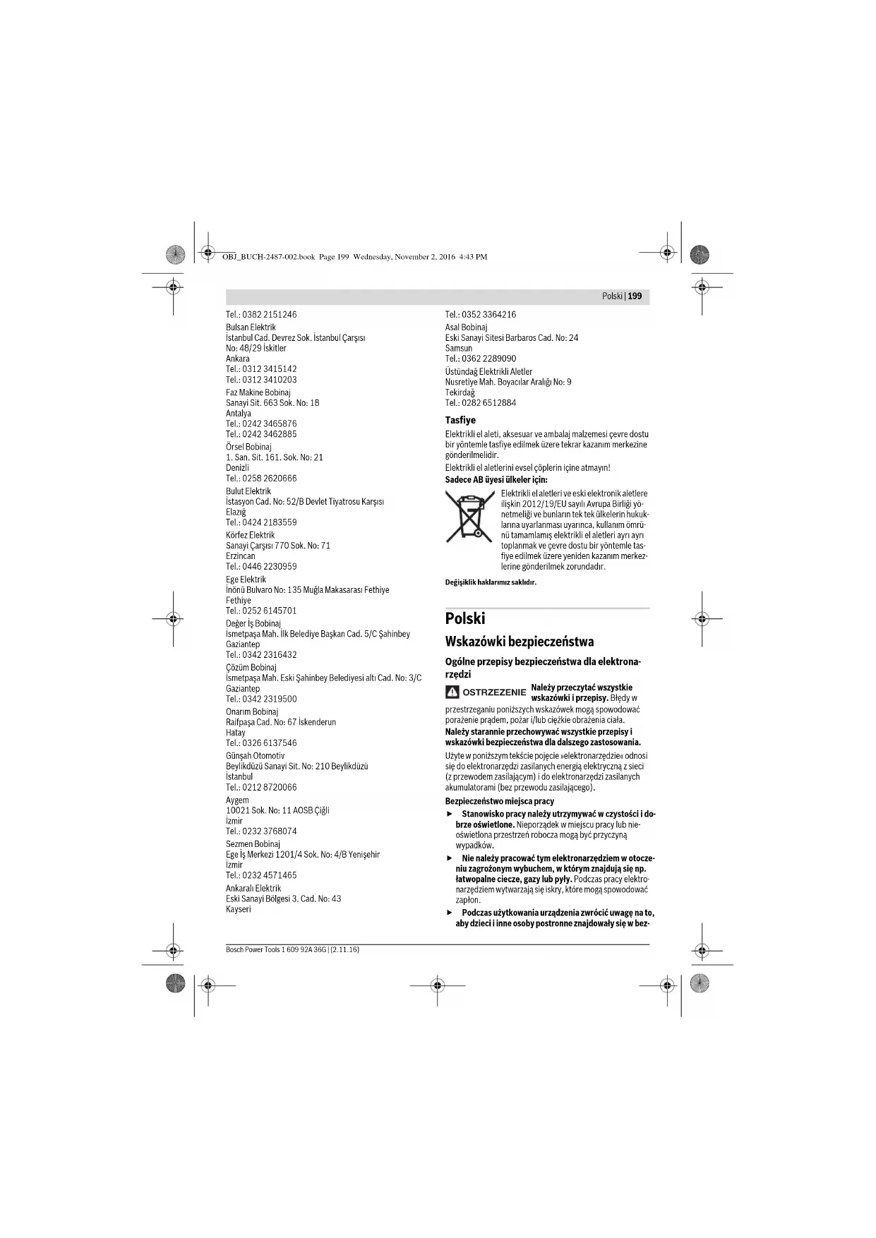 - Denizli Tel.: 0258 2620666 Bulut Elektrik İstasyon Cad. No: 52/B Devlet Tiyatrosu Karşısı Elazığ Tel.: 0424 2183559 Körfez Elektrik Sanayi Çarşısı 770 Sok. No: 71 Erzincan Tel.: 0446 2230959 Ege Elektrik İnönü Bulvaro No: 135 Muğla Makasarası Fethiye Fethiye Tel.: 0252 6145701 Değer İş Bobinaj İsmetpaşa Mah. İlk Belediye Başkan Cad. 5/C Şahinbey Gaziantep Tel.: 0342 2316432 Çözüm Bobinaj İsmetpaşa Mah. Eski Şahinbey Belediyesi altı Cad. No: 3/C Gaziantep Tel.: 0342 2319500 Onarım Bobinaj Raifpaşa Cad. No: 67 İskenderun Hatay Tel.: 0326 6137546 Günşah Otomotiv Beylikdüzü Sanayi Sit. No: 210 Beylikdüzü İstanbul Tel.: 0212 8720066 Aygem 10021 Sok. No: 11 AOSB Çiğli İzmir Tel.: 0232 3768074 Sezmen Bobinaj Ege İş Merkezi 1201/4 Sok. No: 4/B Yenişehir İzmir Tel.: 0232 4571465 Ankaralı Elektrik Eski Sanayi Bölgesi 3. Cad. No: 43 Kayseri Tel.: 0352 3364216 Asal Bobinaj Eski Sanayi Sitesi Barbaros Cad. No: 24 Samsun Tel.: 0362 2289090 Üstündağ Elektrikli Aletler Nusretiye Mah. Boyacılar Aralığı No: 9 Tekirdağ Tel.: 0282 6512884 Tasfiye Elektrikli el aleti, aksesuar ve ambalaj malzemesi çevre dostu bir yöntemle tasfiye edilmek üzere tekrar kazanım merkezine gönderilmelidir. Elektrikli el aletlerini evsel çöplerin içine atmayın! Sadece AB üyesi ülkeler için: Elektrikli el aletleri ve eski elektronik aletlere ilişkin 2012/19/EU sayılı Avrupa Birliği yö- netmeliği ve bunların tek tek ülkelerin hukuk- larına uyarlanması uyarınca, kullanım ömrü- nü tamamlamış elektrikli el aletleri ayrı ayrı toplanmak ve çevre dostu bir yöntemle tas- fiye edilmek üzere yeniden kazanım merkez- lerine gönderilmek zorundadır. Değişiklik haklarımız saklıdır. Polski Wskazówki bezpieczeństwa Ogólne przepisy bezpieczeństwa dla elektrona- rzędzi Należy przeczytać wszystkie wskazówki i przepisy. Błędy w przestrzeganiu poniższych wskazówek mogą spowodować porażenie prądem, pożar i/lub ciężkie obrażenia ciała. Należy starannie przechowywać wszystkie przepisy i wskazówki bezpieczeństwa dla dalszego zastosowania. Użyte w poniższym tekście pojęcie »elektronarzędzie« odnosi się do elektronarzędzi zasilanych energią elektryczną z sieci (z przewodem zasilającym) i do elektronarzędzi zasilanych akumulatorami (bez przewodu zasilającego). Bezpieczeństwo miejsca pracy Stanowisko pracy należy utrzymywać w czystości i do- brze oświetlone. Nieporządek w miejscu pracy lub nie- oświetlona przestrzeń robocza mogą być przyczyną wypadków. Nie należy pracować tym elektronarzędziem w otocze- niu zagrożonym wybuchem, w którym znajdują się np. łatwopalne ciecze, gazy lub pyły. Podczas pracy elektro- narzędziem wytwarzają się iskry, które mogą spowodować zapłon. Podczas użytkowania urządzenia zwrócić uwagę na to, aby dzieci i inne osoby postronne znajdowały się w bez- OSTRZEZENIE OBJ_BUCH-2487-002.book Page 199 Wednesday, November 2, 2016 4:43 PM200 | Polski 1 609 92A 36G | (2.11.16) Bosch Power Tools piecznej odległości. Odwrócenie uwagi może spowodo- wać utratę kontroli nad narzędziem. Bezpieczeństwo elektryczne Wtyczka elektronarzędzia musi pasować do gniazda. Nie wolno zmieniać wtyczki w jakikolwiek sposób. Nie wolno używać wtyków adapterowych w przypadku elektronarzędzi z uziemieniem ochronnym. Niezmienio- ne wtyczki i pasujące gniazda zmniejszają ryzyko poraże- nia prądem. Należy unikać kontaktu z uziemionymi powierzchniami jak rury, grzejniki, piece i lodówki. Ryzyko porażenia prądem jest większe, gdy ciało użytkownika jest uziemio- ne. Urządzenie należy zabezpieczyć przed deszczem i wil- gocią. Przedostanie się wody do elektronarzędzia pod- wyższa ryzyko porażenia prądem. Nigdy nie należy używać przewodu do innych czynno- ści. Nigdy nie należy nosić elektronarzędzia, trzymając je za przewód, ani używać przewodu do zawieszenia urządzenia; nie wolno też wyciągać wtyczki z gniazdka pociągając za przewód. Przewód należy chronić przed wysokimi temperaturami, należy go trzymać z dala od oleju, ostrych krawędzi lub ruchomych części urządze- nia. Uszkodzone lub splątane przewody zwiększają ryzyko porażenia prądem. W przypadku pracy elektronarzędziem pod gołym nie- bem, należy używać przewodu przedłużającego, dosto- sowanego również do zastosowań zewnętrznych. Uży- cie właściwego przedłużacza (dostosowanego do pracy na zewnątrz) zmniejsza ryzyko porażenia prądem. Jeżeli nie da się uniknąć zastosowania elektronarzę- dzia w wilgotnym otoczeniu, należy użyć wyłącznika ochronnego różnicowo-prądowego. Zastosowanie wyłącznika ochronnego różnicowo-prądowego zmniejsza ryzyko porażenia prądem. Bezpieczeństwo osób Podczas pracy z elektronarzędziem należy zachować ostrożność, każdą czynność wykonywać uważnie i z rozwagą. Nie należy używać elektronarzędzia, gdy jest się zmęczonym lub będąc pod wpływem narkotyków, alkoholu lub lekarstw. Moment nieuwagi przy użyciu elektronarzędzia może stać się przyczyną poważnych ura- zów ciała. Należy nosić osobiste wyposażenie ochronne i zawsze okulary ochronne. Noszenie osobistego wyposażenia ochronnego – maski przeciwpyłowej, obuwia z podeszwami przeciwpoślizgowymi, kasku ochronnego lub środków ochrony słuchu (w zależności od rodzaju i zastosowania elektronarzędzia) – zmniejsza ryzyko obra- żeń ciała. Należy unikać niezamierzonego uruchomienia narzę- dzia. Przed włożeniem wtyczki do gniazdka i/lub podłą- czeniem do akumulatora, a także przed podniesieniem lub przeniesieniem elektronarzędzia, należy upewnić się, że elektronarzędzie jest wyłączone. Trzymanie pal- ca na wyłączniku podczas przenoszenia elektronarzędzia lub podłączenie do prądu włączonego narzędzia, może stać się przyczyną wypadków. Przed włączeniem elektronarzędzia, należy usunąć na- rzędzia nast
