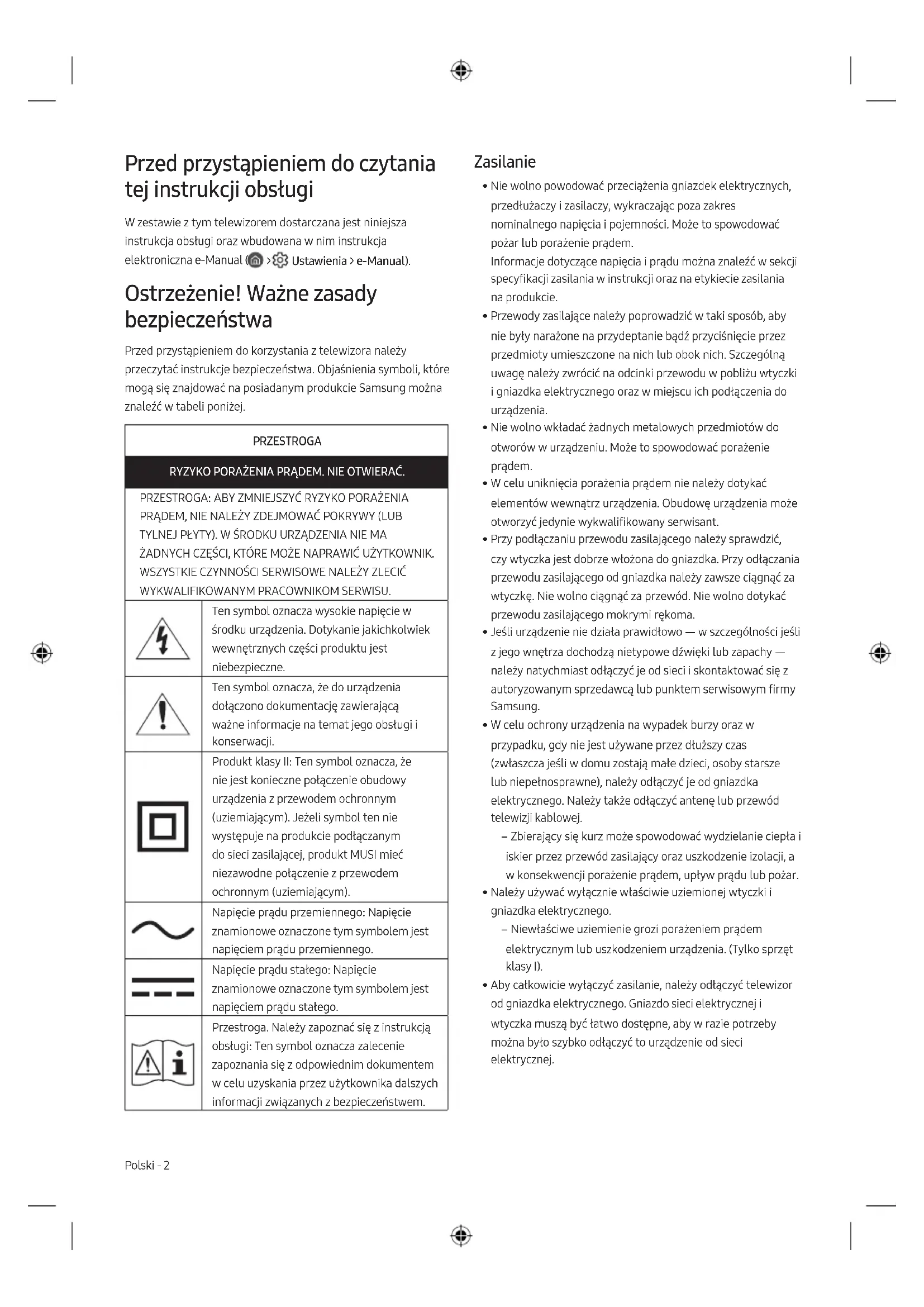 - Aby całkowicie wyłączyć zasilanie, należy odłączyć telewizor od gniazdka elektrycznego. Gniazdo sieci elektrycznej i wtyczka muszą być łatwo dostępne, aby w razie potrzeby można było szybko odłączyć to urządzenie od sieci elektrycznej. Polski Polski - 2Instalacja