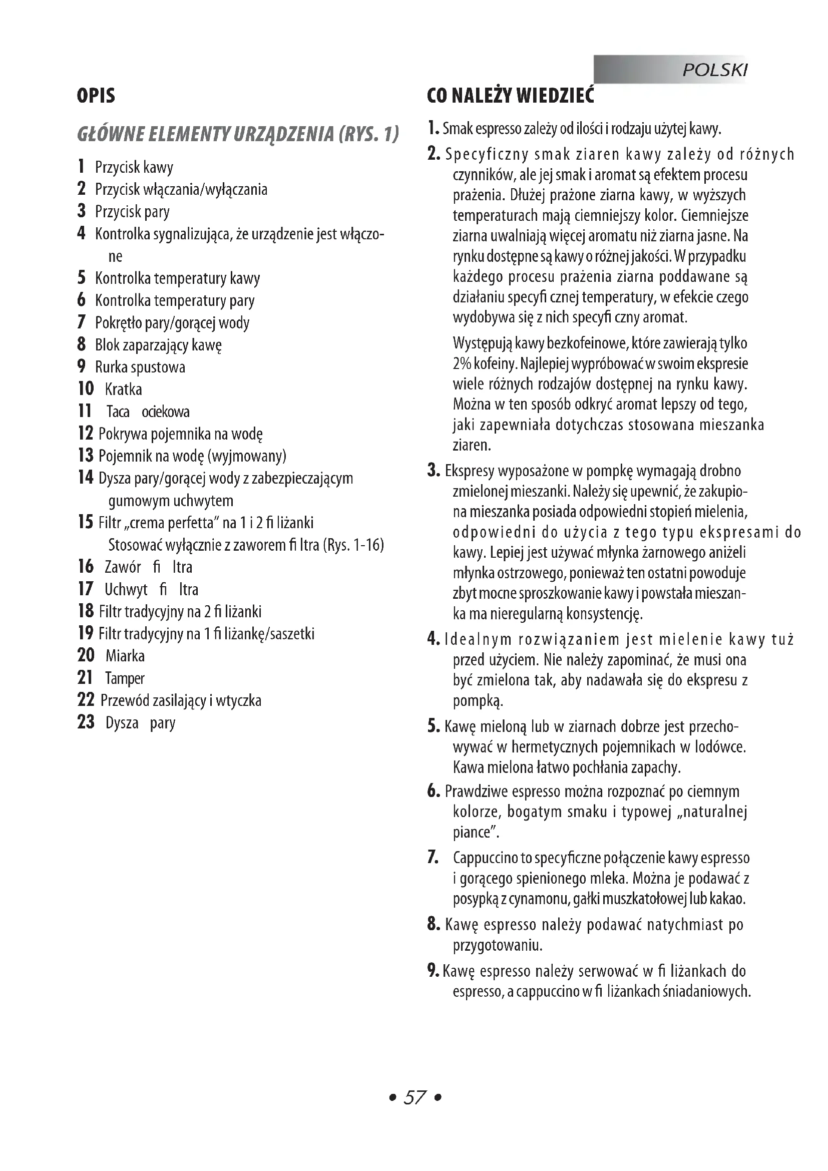 POLSKI OPIS GŁÓWNE ELEMENTY URZĄDZENIA (RYS. 1) 1 Przycisk kawy 2 Przycisk włączania/wyłączania 3 Przycisk pary 4 Kontrolka sygnalizująca, że urządzenie jest włączo-