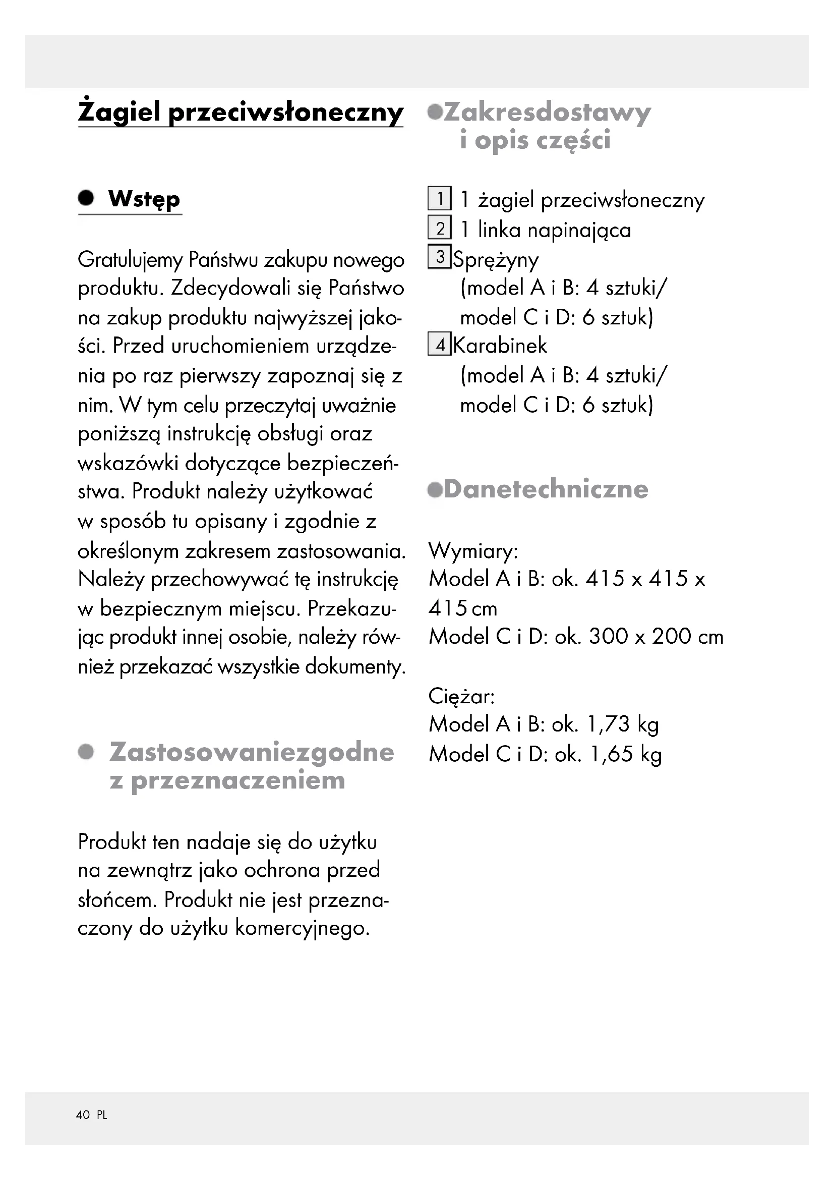 Karabinek (model A i B: 4 sztuki/ model C i D: 6 sztuk) Dane techniczne Wymiary: Model A i B: ok. 415 x 415 x 415 cm Model C i D: ok. 300 x 200 cm Ciężar: Model A i B: ok. 1,73 kg Model C i D: ok. 1,65 kg41 PL Wskazówki bezpieczeństwa