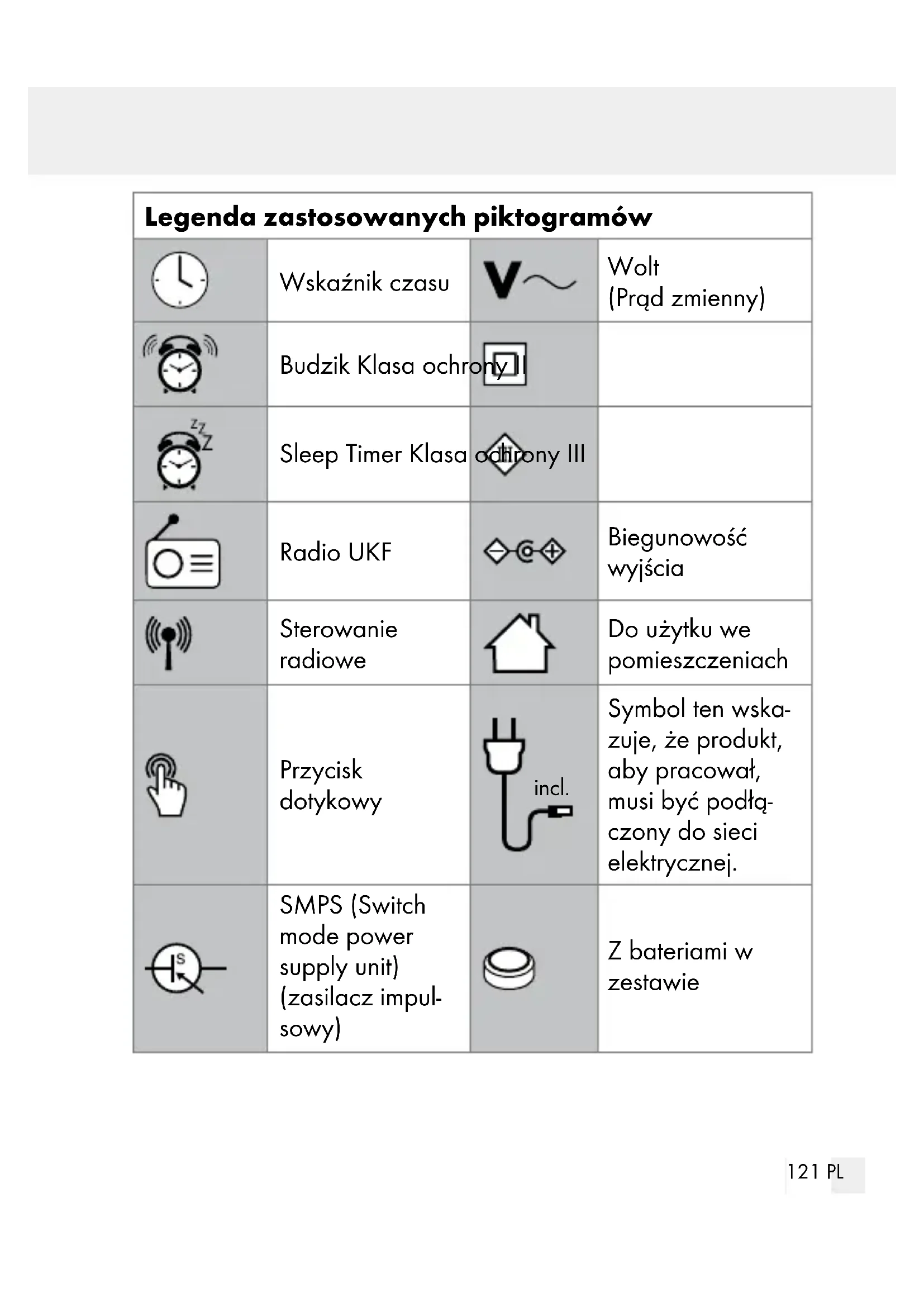 angen. Deze garantie komt te vervallen als het product besc hadigd wordt, niet correct gebruikt of onderhouden wordt. De garantie geldt voor materiaal- en productiefouten. Deze garan- tie is niet van toepassing op productonderdelen, die onderhevig zijn aan normale slijtage en hierdoor als aan slijtage onderhevige onderdelen gelden (bijv. batterijen) of voor beschadigingen aan breekbare onderdelen, zoals bijv. schakelaars, accu’s of dergelijke onderdelen, die gemaakt zijn van glas.119 PL Legenda zastosowanych piktogramów.....................................................Strona 121 Wstęp .......................................................................Strona 122 Zastosowanie zgodne z przeznaczeniem ..............Strona 122 Opis części ................................................................Strona 123 Zawartość ..................................................................Strona 124 Dane techniczne .......................................................Strona 124 Ogólne wskazówki bezpieczeństwa ...............................................Strona 125 Wskazówki bezpieczeństwa dla baterii / akumulatorów ............................................................Strona 127 Przed uruchomieniem ................................Strona 129 Ustawianie produktu ..................................Strona 130 Obsługa ..................................................................Strona 131 Odbiór sygnału radiowego DCF .............................Strona 131 Wskazywanie czasu letniego (DST) ........................Strona 133 Włączanie / wyłączanie automatycznej funkcji odbioru czasu radiowego ............................Strona 133 Ustawianie podświetlenia wyświetlacza LCD .........Strona 133 Ustawianie godziny ..................................................Strona 134 Funkcje alarmu ..........................................................Strona 135 Ustawianie alarmu ....................................................Strona 136 Wyłączanie alarmu ..................................................Strona 138120 PL Ustawianie radia ............................................Strona 139 Wyszukiwanie stacji .................................................Strona 139 Zapisywanie stacji.....................................................Strona 140 Szybki test ............................................................Strona 141 Stosowanie jako lampa ...........................Strona 141 Światło relaksujące .....................................Strona 142 Tryb Sleep Timer .............................................Strona 142 Zasialnie bateriamii .....................................Strona 143 Wymiana baterii .............................................Strona 144 Czyszczenie i pielęgnacja ........................Strona 145 Usuwanie usterek ..........................................Strona 145 Uproszczona deklaracja zgodności UE ......................................................Strona 145 Utylizacja ..............................................................Strona 146 Gwarancja ...........................................................Strona 147121 PL Legenda zastosowanych piktogramów Wskaźnik czasu Wolt (Prąd zmienny) Budzik Klasa ochrony II Sleep Timer Klasa ochrony III Radio UKF Biegunowość wyjścia Sterowanie radiowe Do użytku we pomieszczeniach Przycisk dotykowy incl. Symbol ten wska- zuje, że produkt, aby pracował, musi być podłą- czony do sieci elektrycznej. SMPS (Switch mode power supply unit) (zasilacz impul- sowy) Z bateriami w zestawie122 PL Legenda zastosowanych piktogramów Odporny na zwarcie transfor- mator bezpie- czeństwa ta = 40 °C Maksymalnie do- puszczana tempe- ratura otoczenia Wolt (Prąd stały) Zdalnie sterowany budzik świetlny z radiem Wstęp Gratulujemy Państwu zakupu nowego produktu. Tym samym zdecydowali się Państwo na zakup produktu wysokiej jakości. Instrukcja obsługi jest częścią tego produktu. Zawiera ona ważne wskazówki dotyczące bezpieczeństwa, użytkowania iutylizacji. Przed pierwszym użyciem produktu należy zapoznać się ze wszy st- kimi wskazówkami dotyczącymi obsługi ibezpieczeństwa. Używ