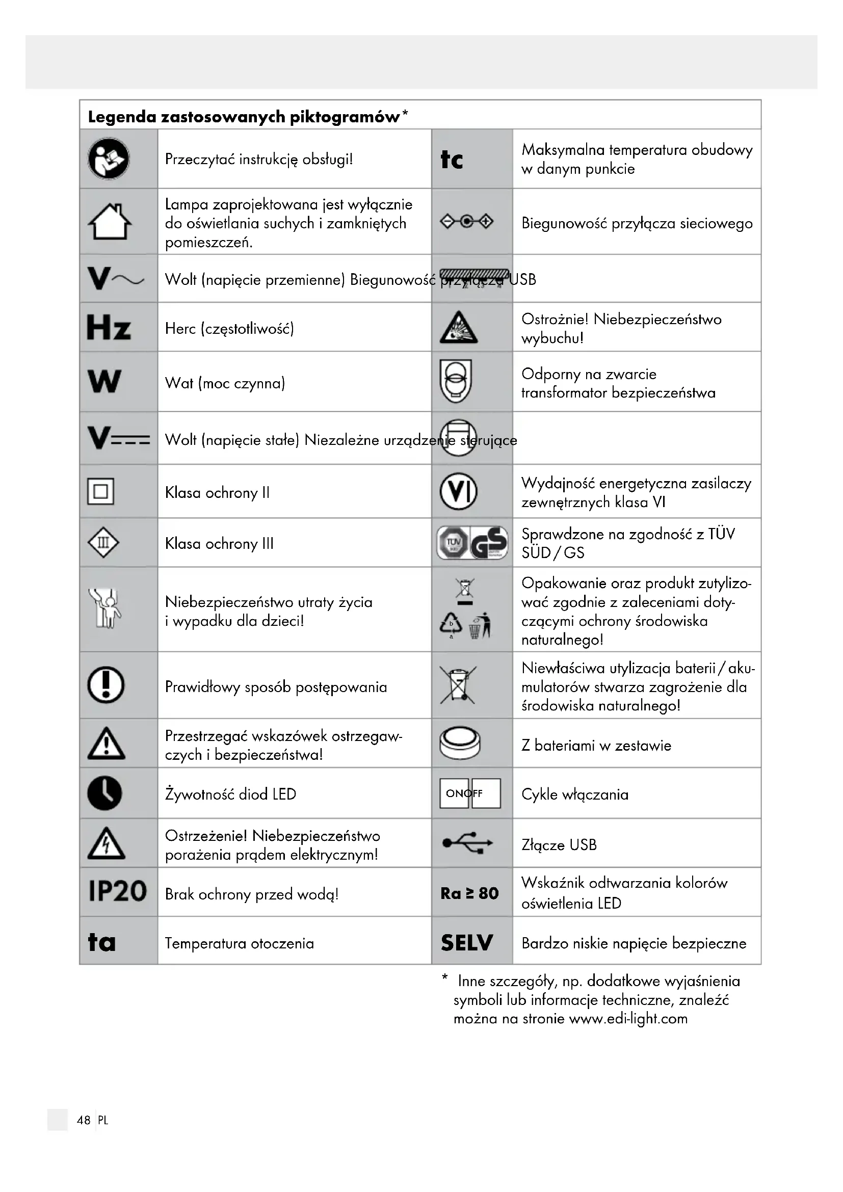 Maksymalna temperatura obudowy w danym punkcie Lampa zaprojektowana jest wyłącznie do oświetlania suchych i zamkniętych pomieszczeń. Biegunowość przyłącza sieciowego Wolt (napięcie przemienne) Biegunowość przyłącza USB Herc (częstotliwość) Ostrożnie! Niebezpieczeństwo wybuchu! Wat (moc czynna) Odporny na zwarcie transformator bezpieczeństwa Wolt (napięcie stałe) Niezależne urządzenie sterujące Klasa ochrony II Wydajność energetyczna zasilaczy zewnętrznych klasa VI Klasa ochrony III Sprawdzone na zgodność z TÜV